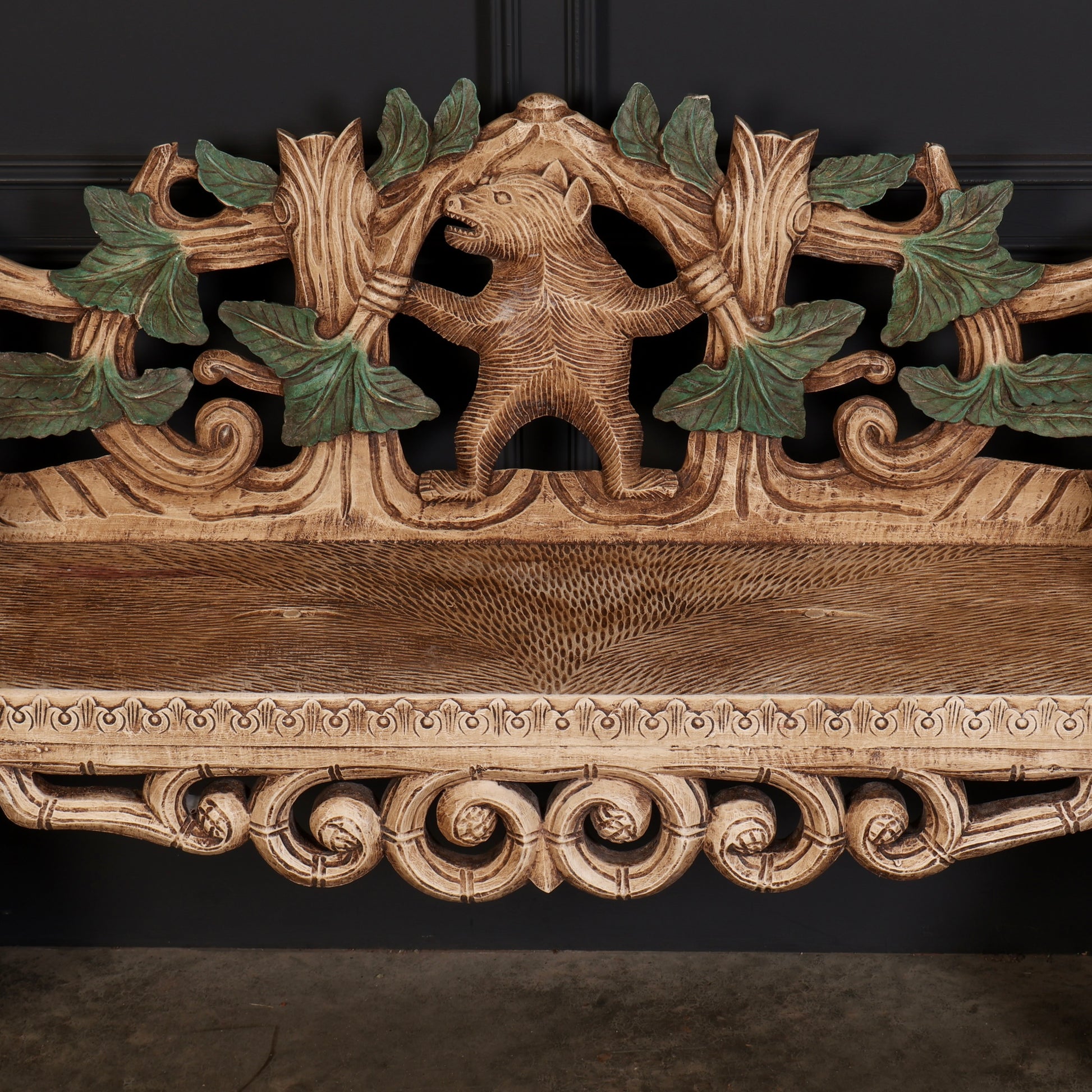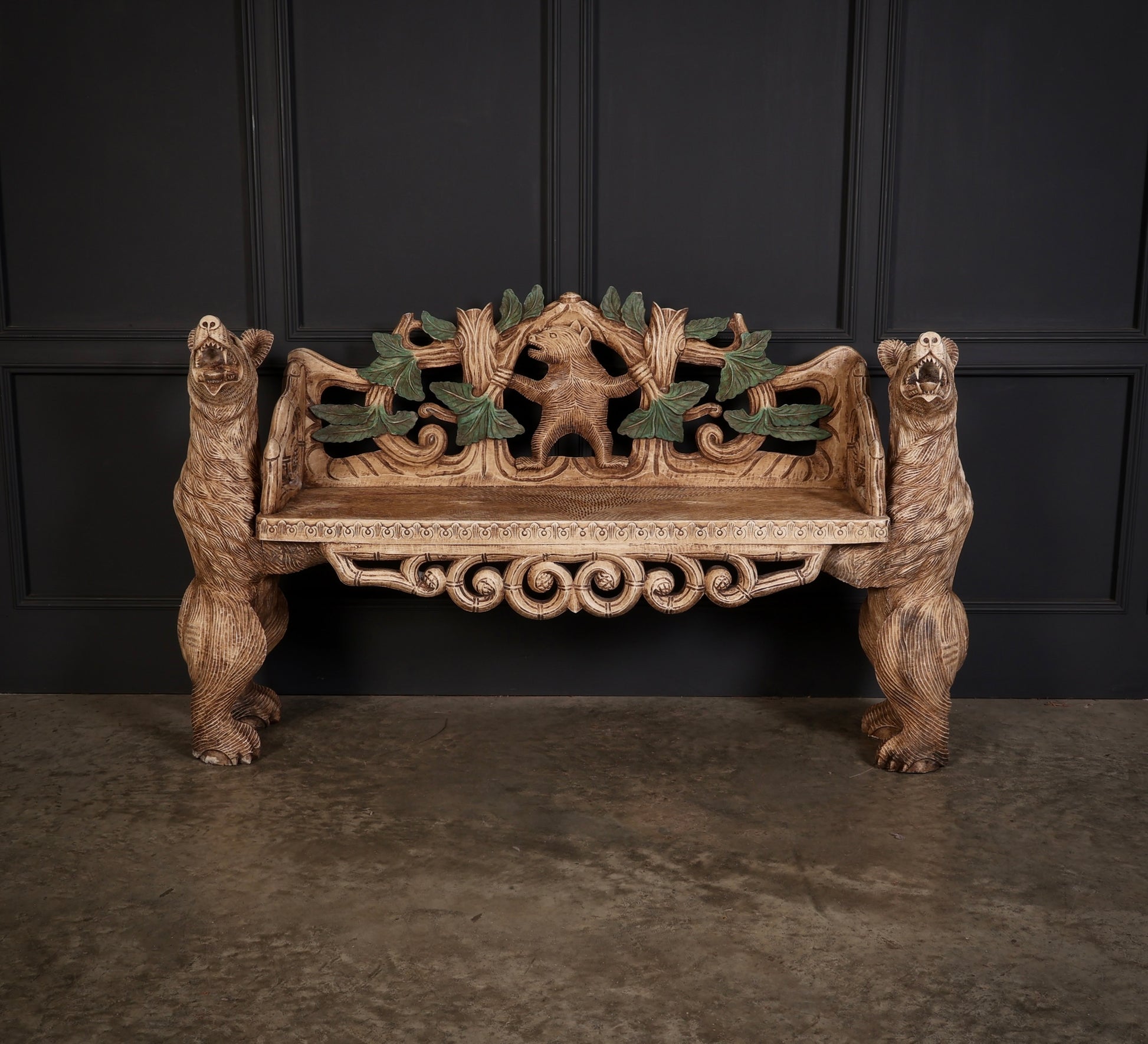 A truly unique and captivating carved wood bench featuring two large, intricately carved bears at either end, this bench is a rare example of the highly sought-after Black Forest bear style.