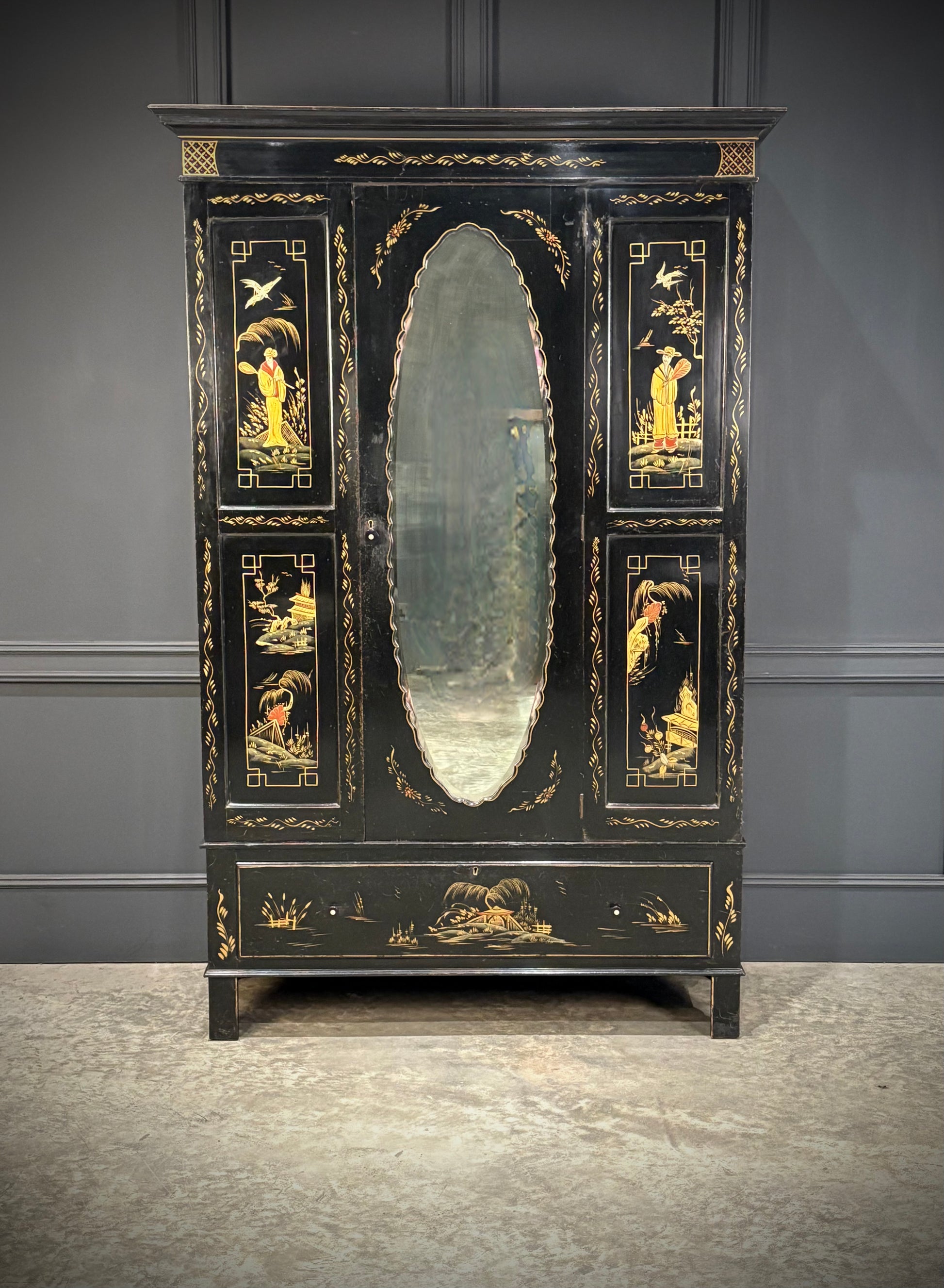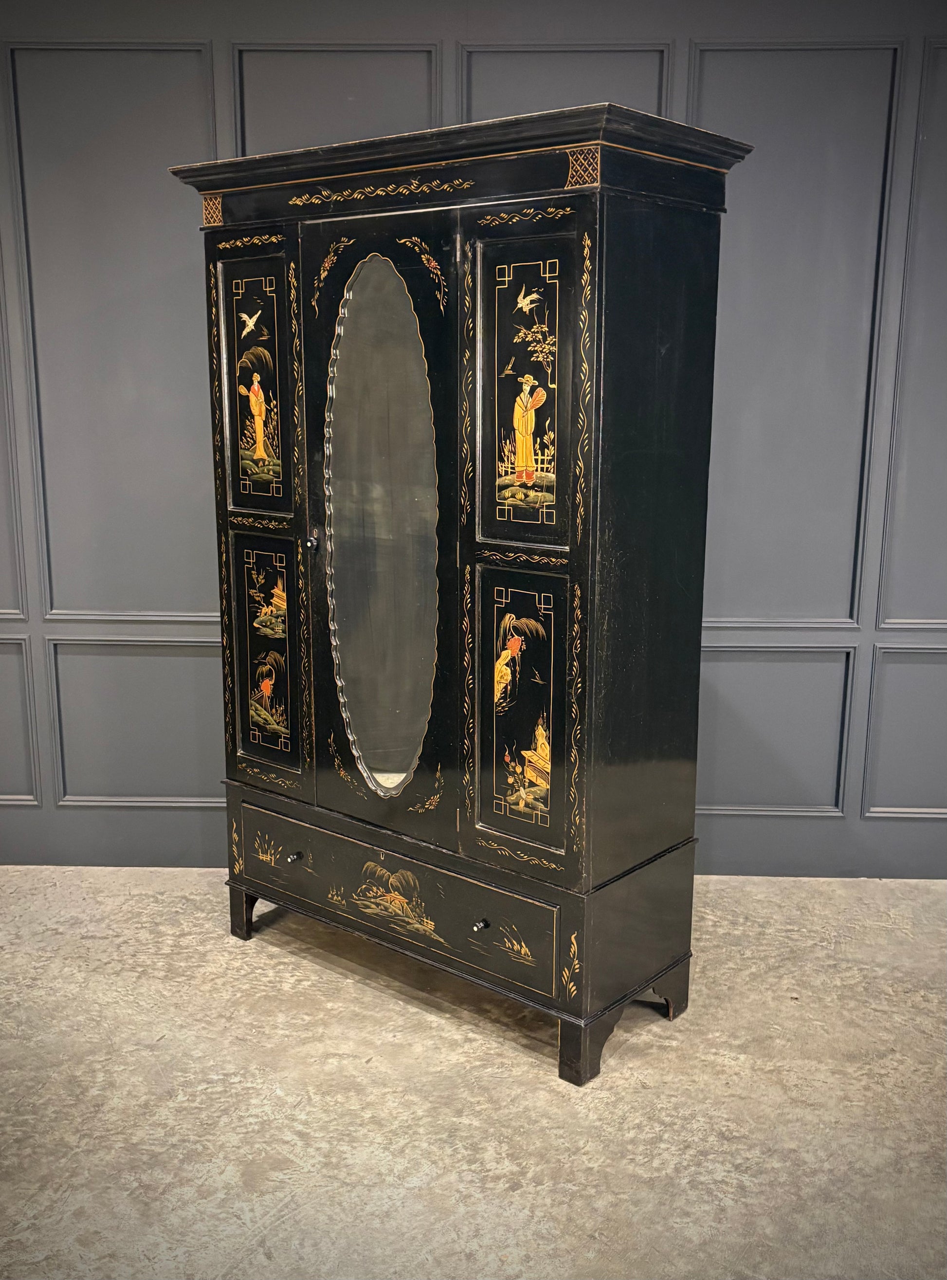 An early 20th-century chinoiserie wardrobe, beautifully decorated in black lacquer with detailed gilt hand-painted scenes.