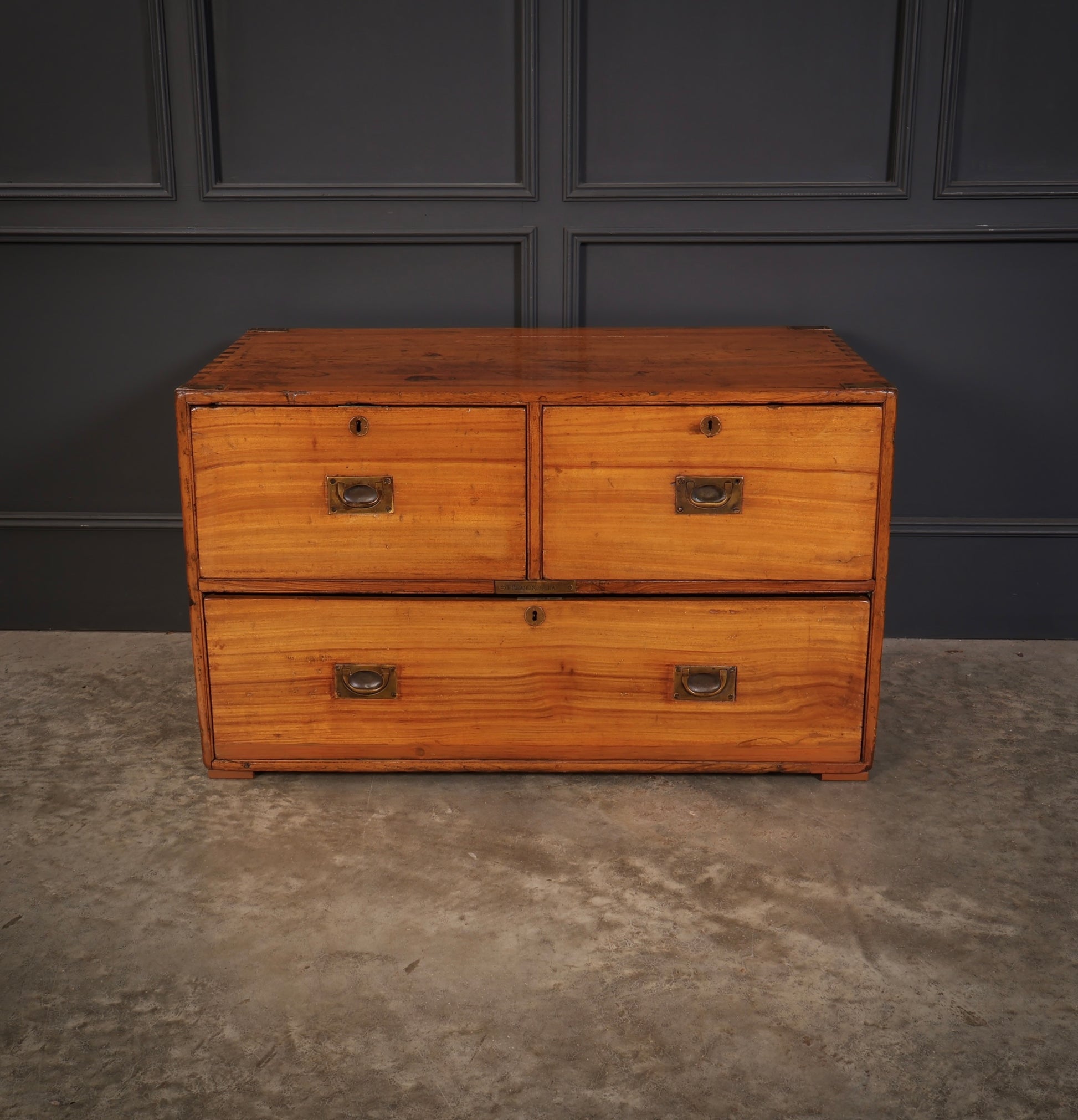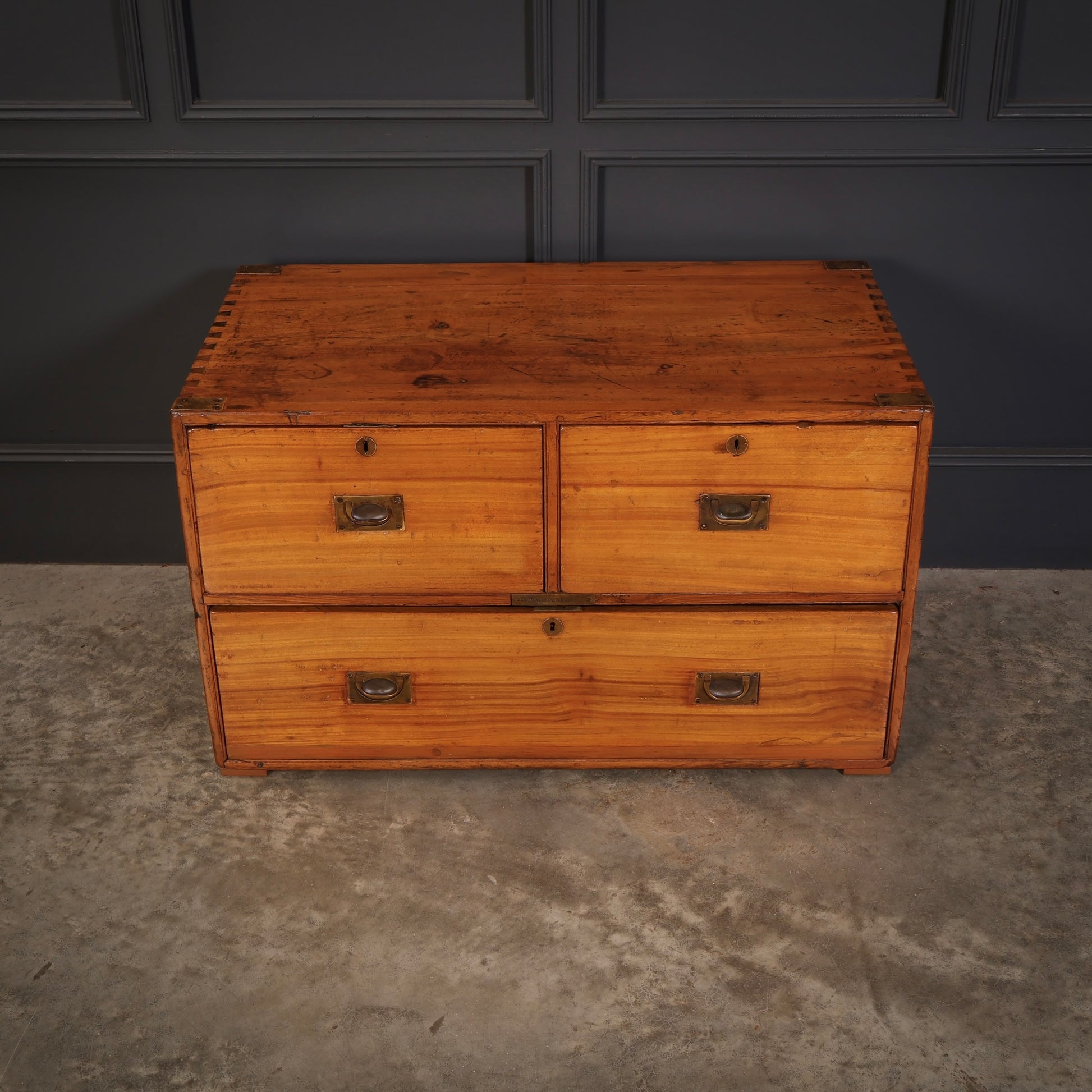 The chest features three drawers with recessed brass campaign handles and brass corner fittings, retaining a warm, rich patina to the camphor wood grain. Side carrying handles remain intact, highlighting its original portable military design.