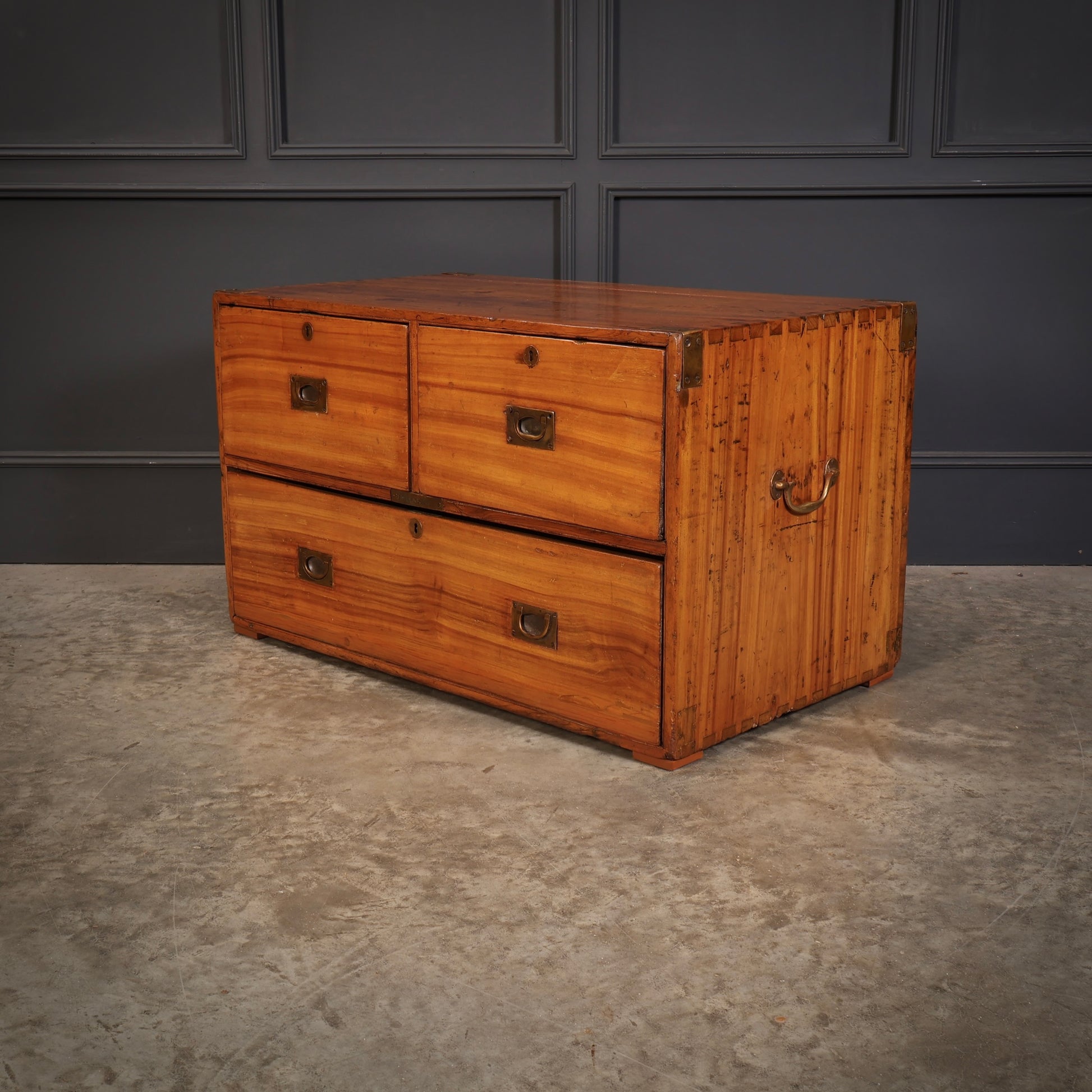 A fine example of a late 19th century camphor wood campaign chest, now perfectly suited for use as a coffee table.