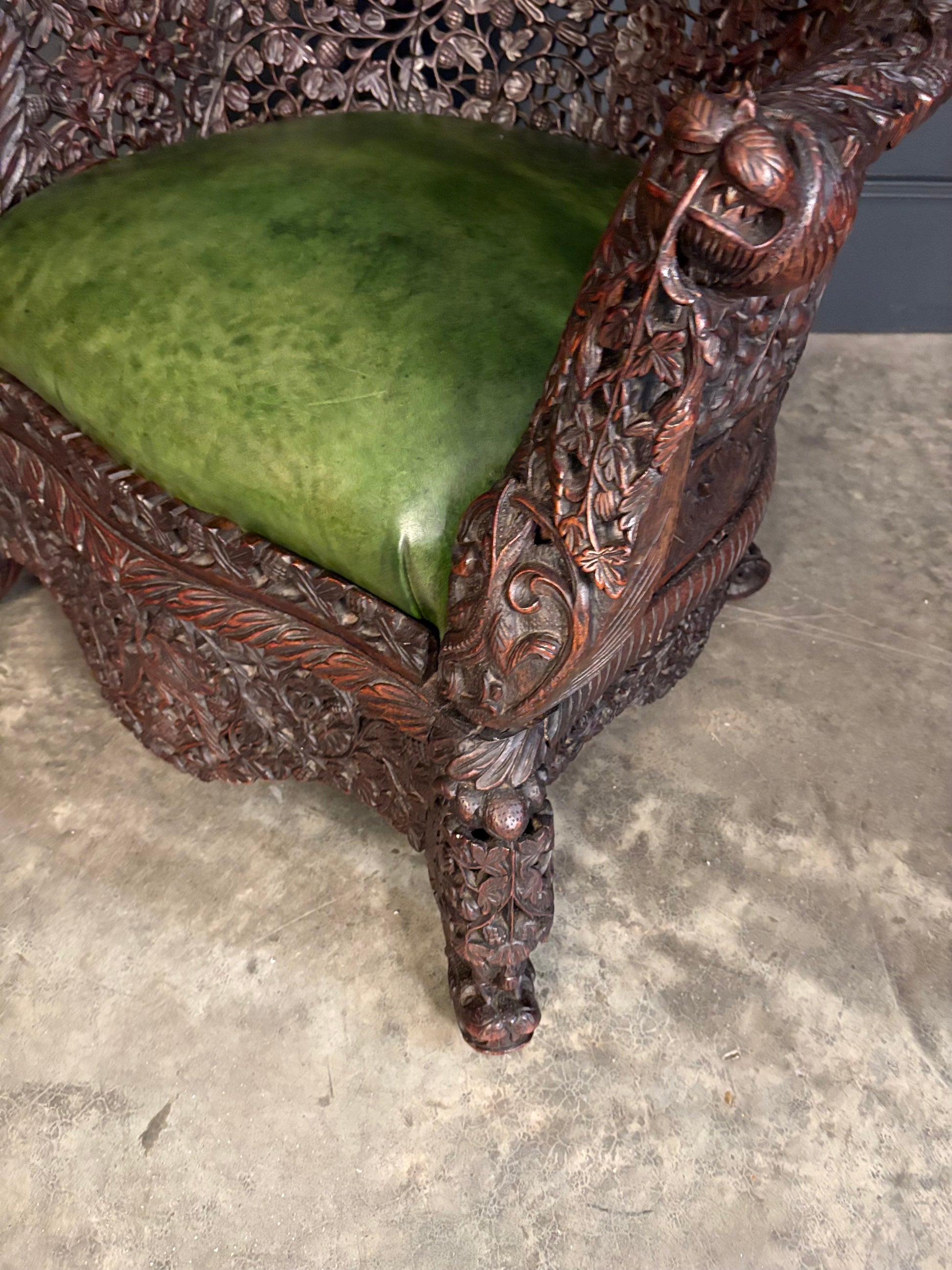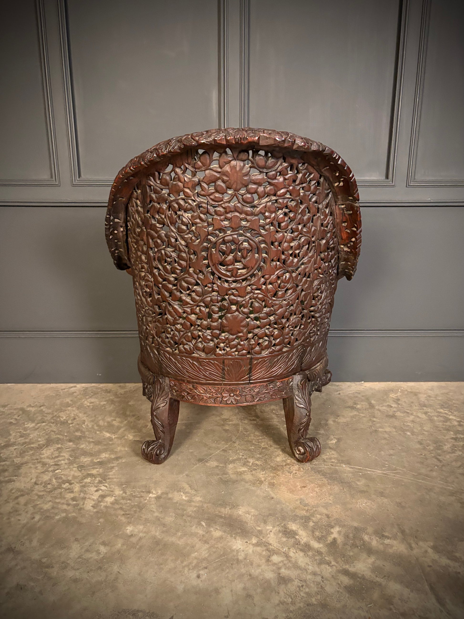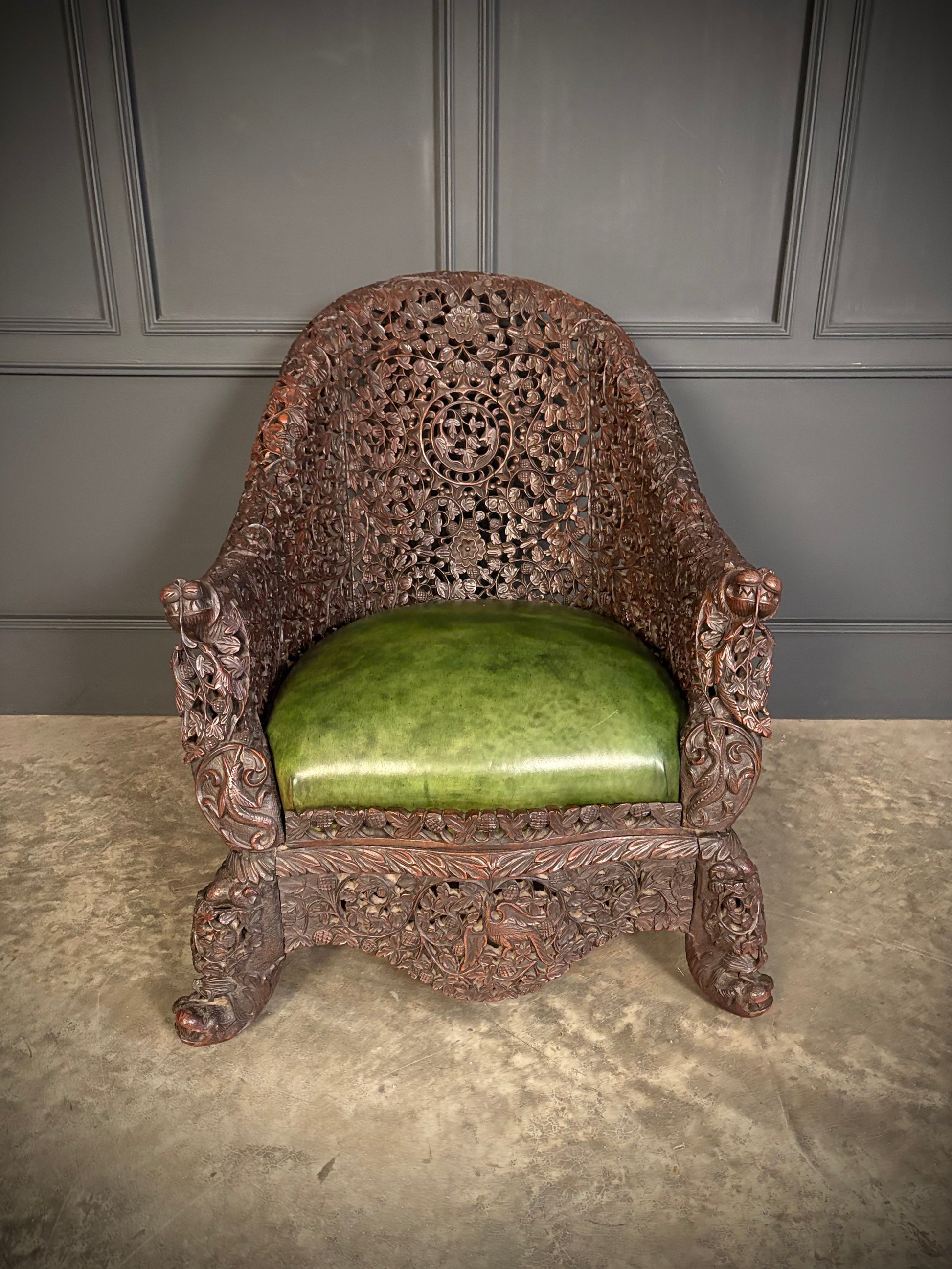 A finely carved Burmese hardwood armchair, dating to circa 1880, showcasing exceptional carvings throughout.