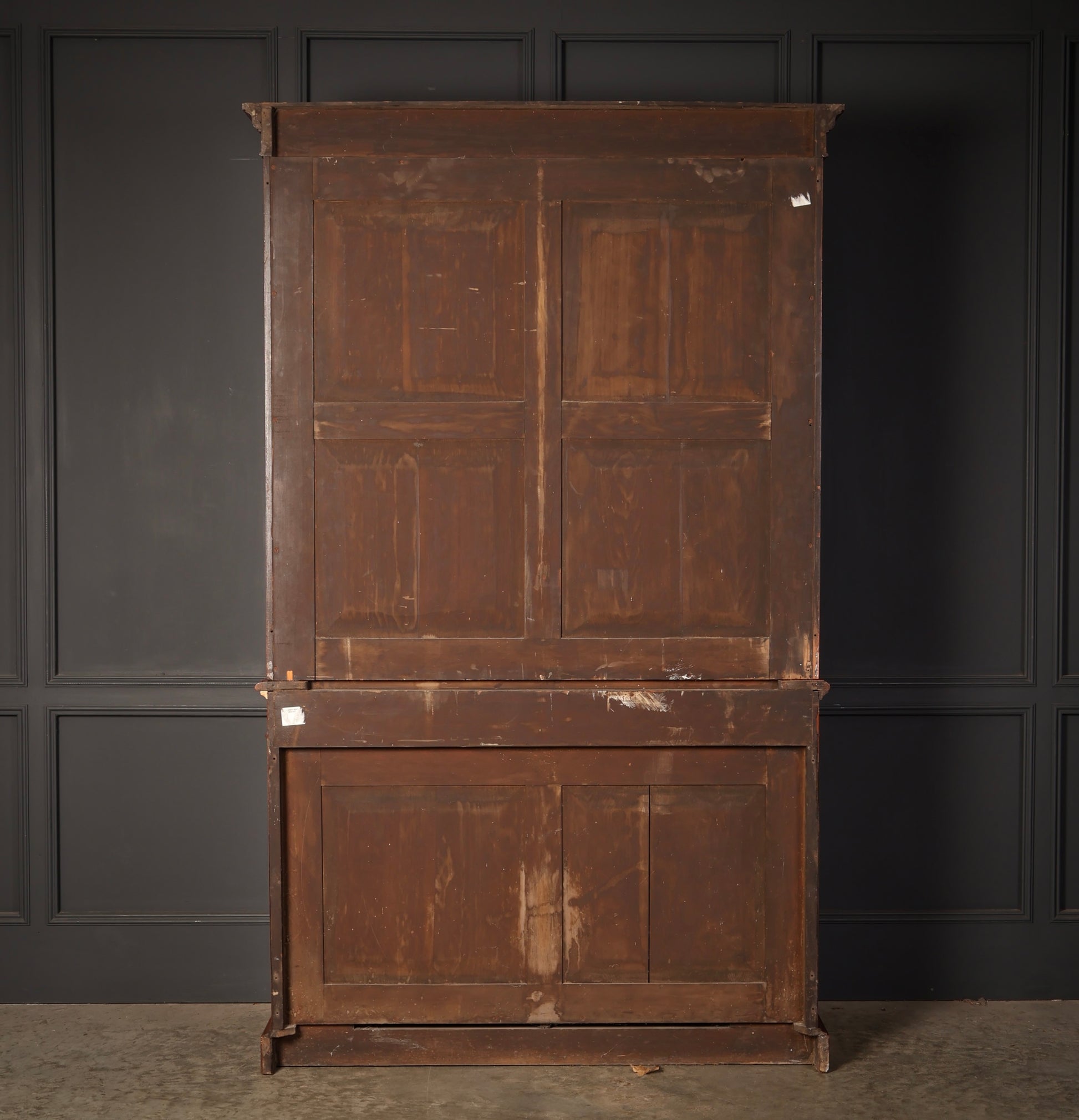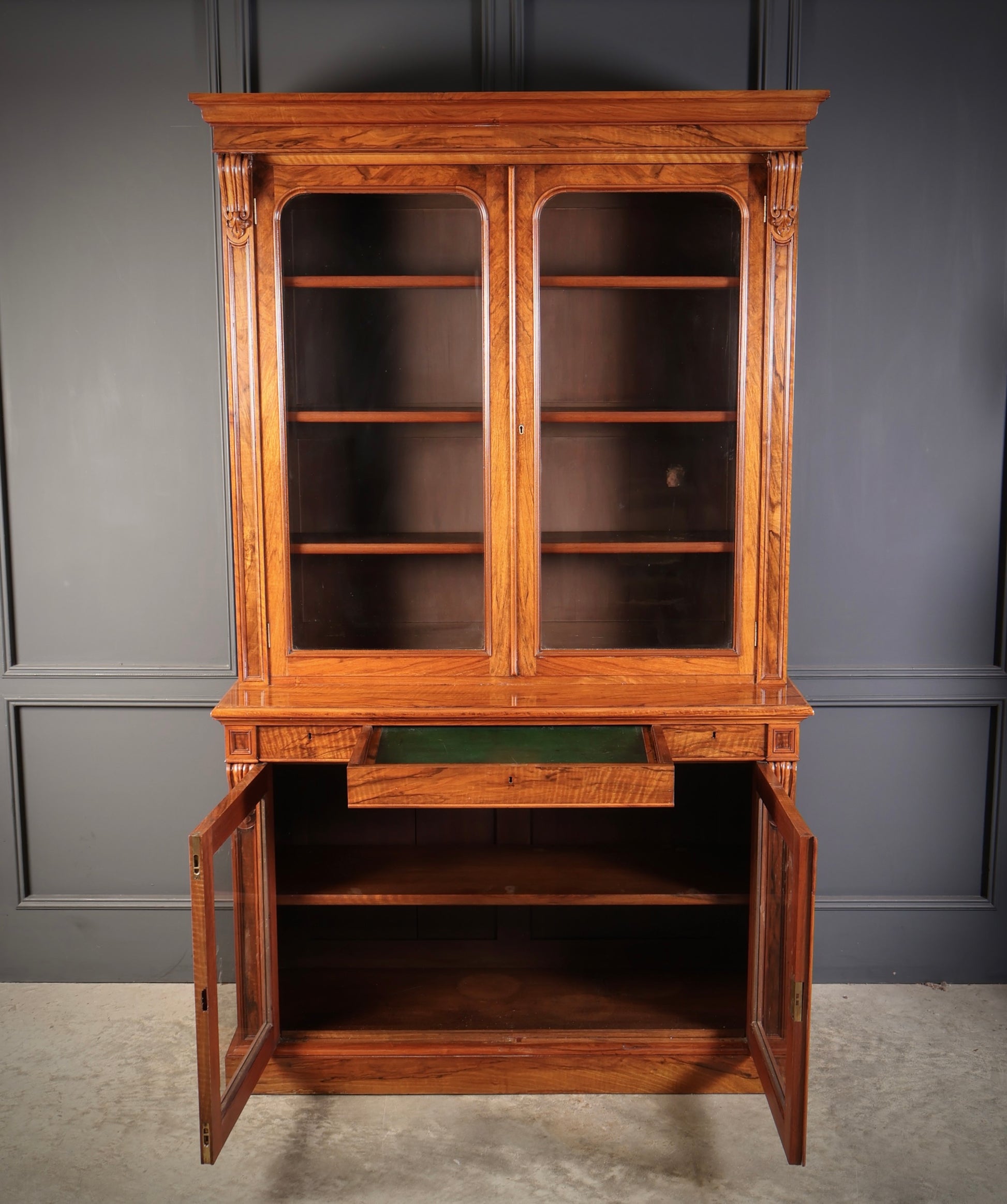 A particularly desirable feature is the central drawer, which opens to reveal a fitted writing slope with a green leather insert – a rare and practical addition. The bookcase comes in two sections for ease of transport.