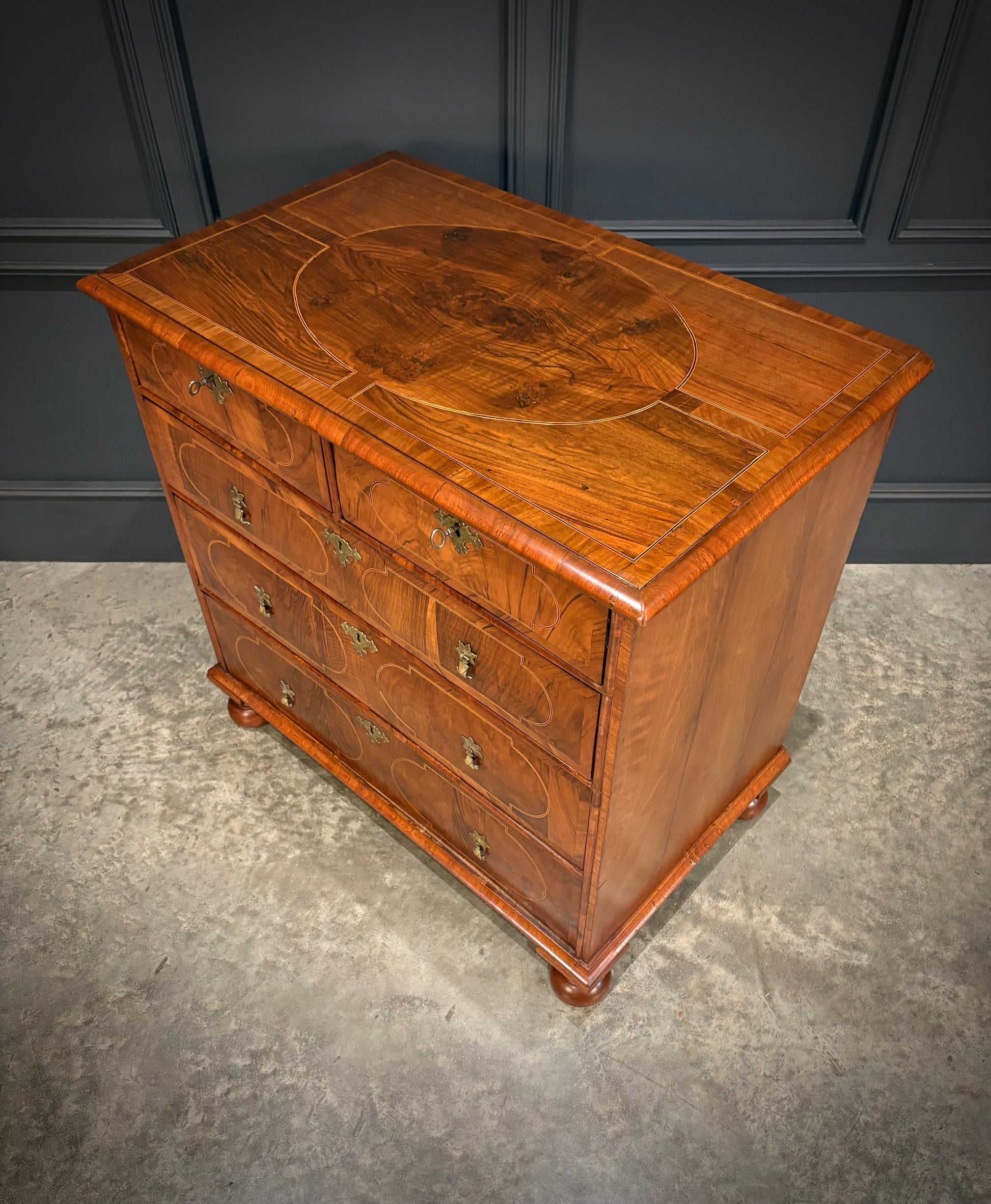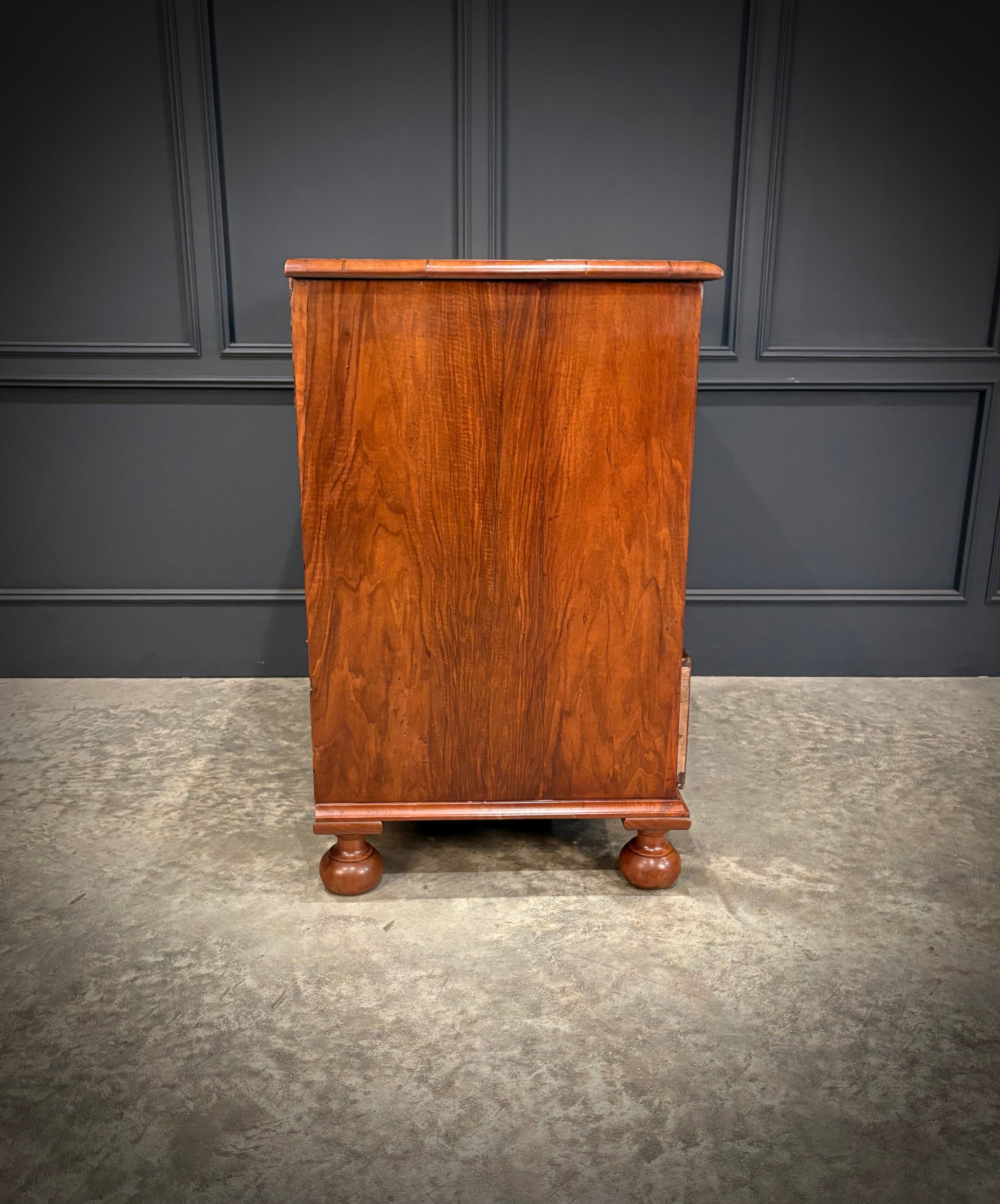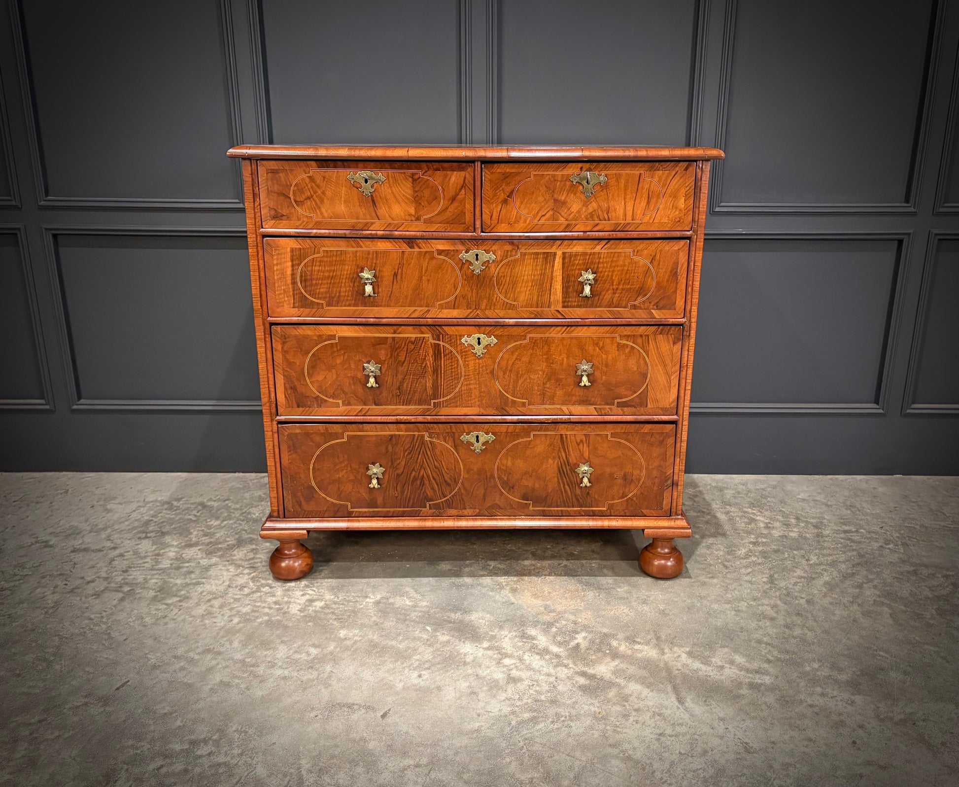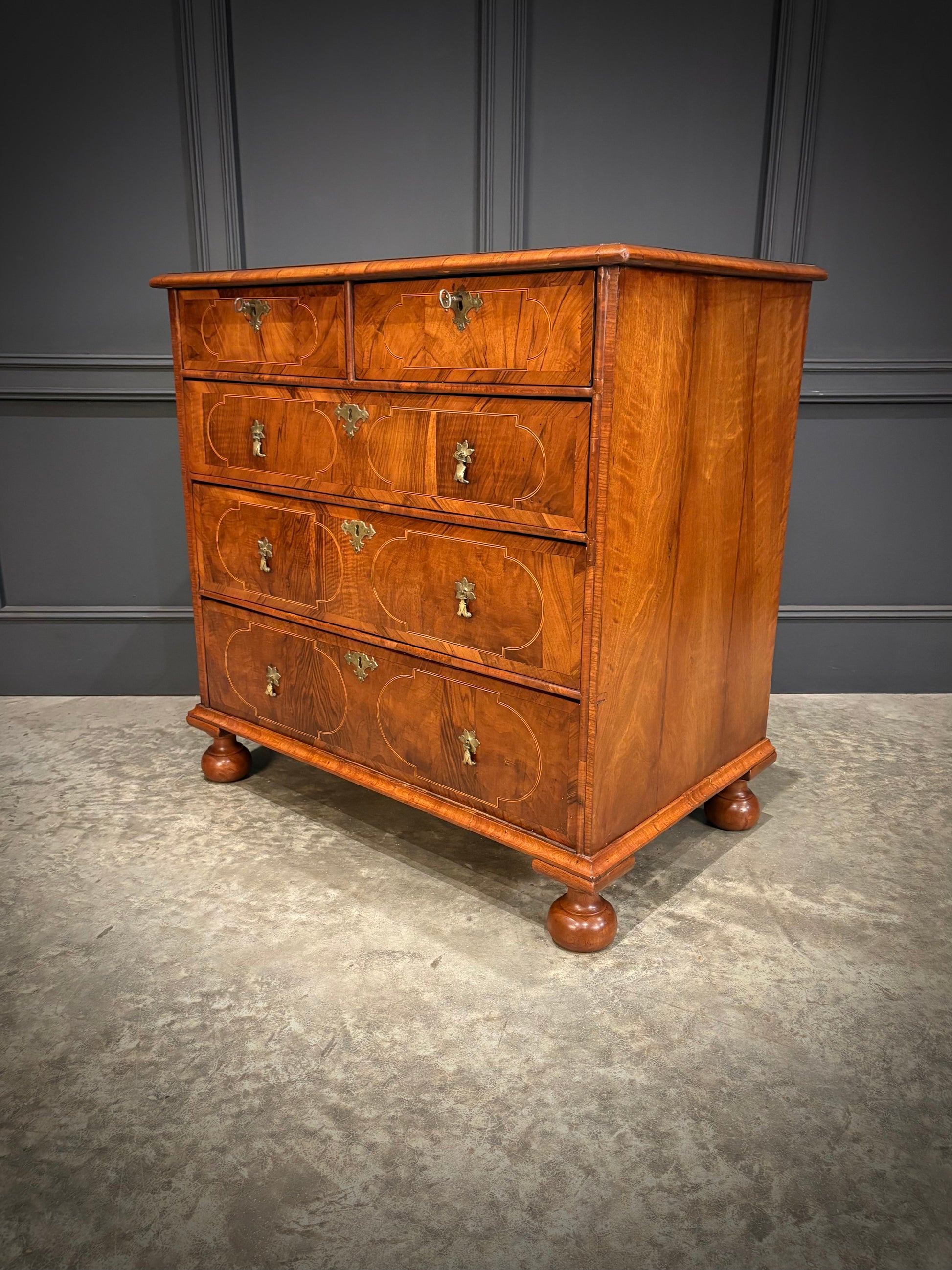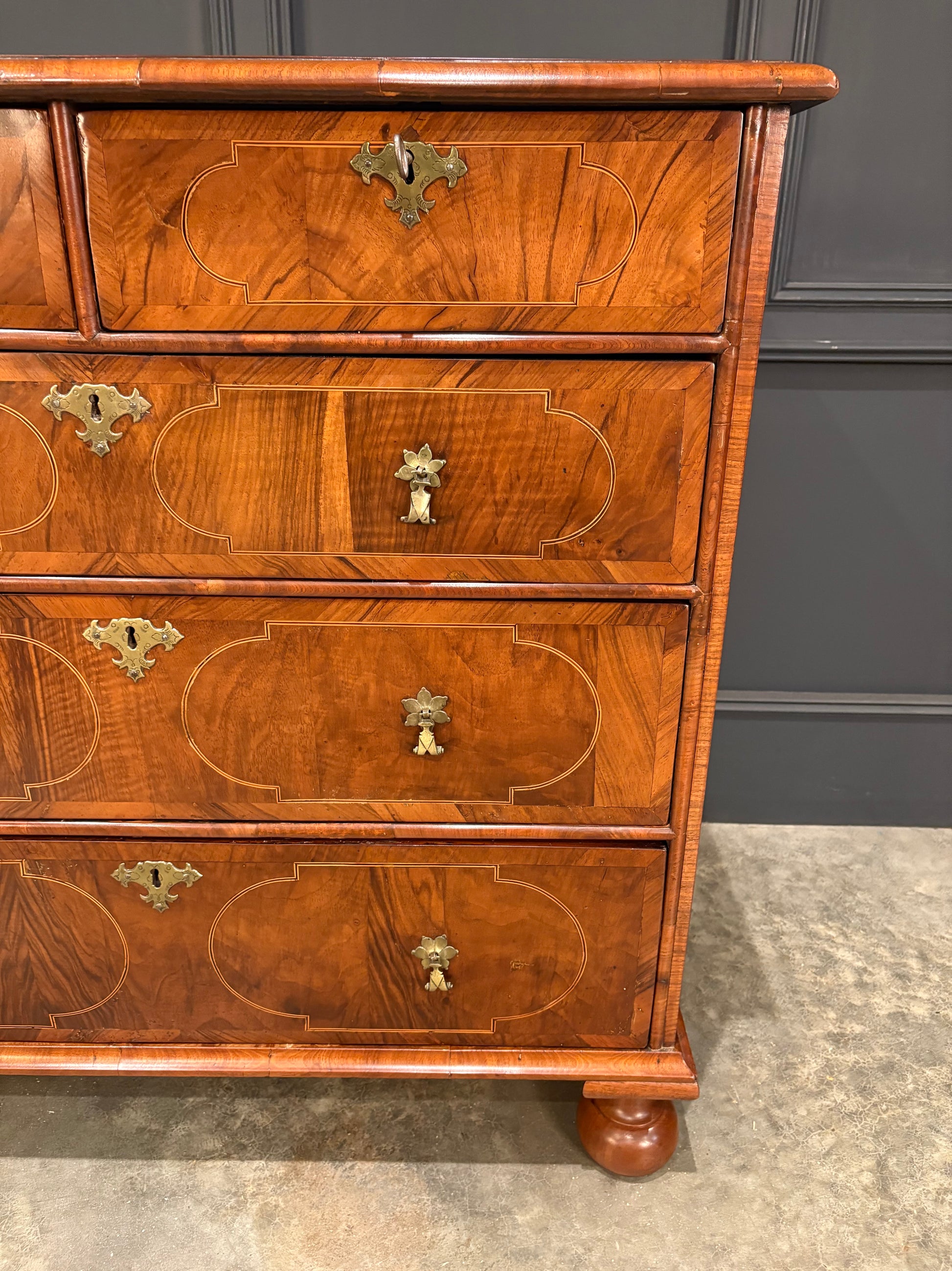 A beautiful example of late 17th-century craftsmanship, this William and Mary period walnut chest features two short drawers over three long graduated drawers, offering excellent storage.