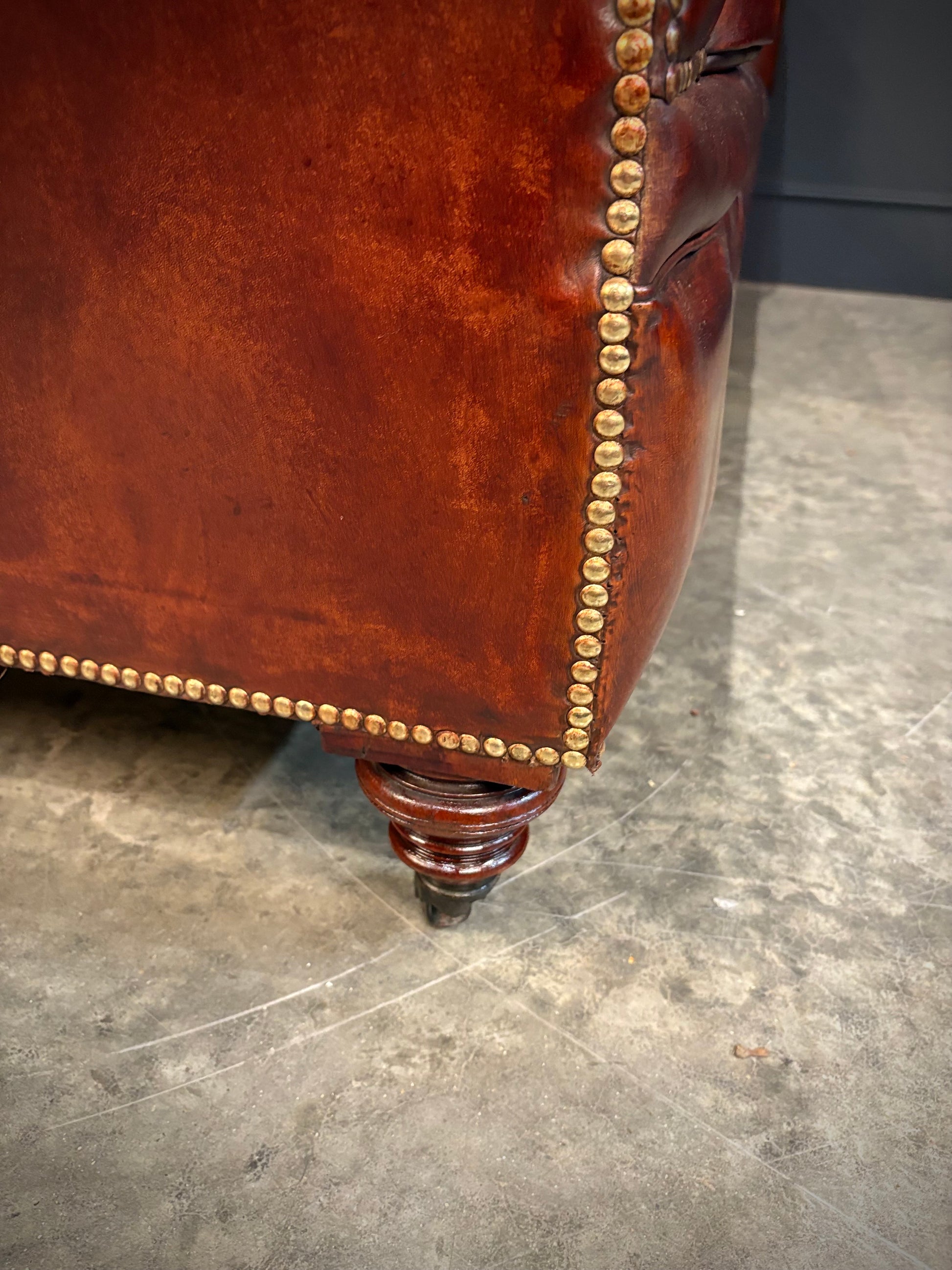 This classic piece features deep buttoned to the back, arms and front apron, elegant rolled arms with decorative stud detailing, and stands on traditional turned mahogany legs with castors.