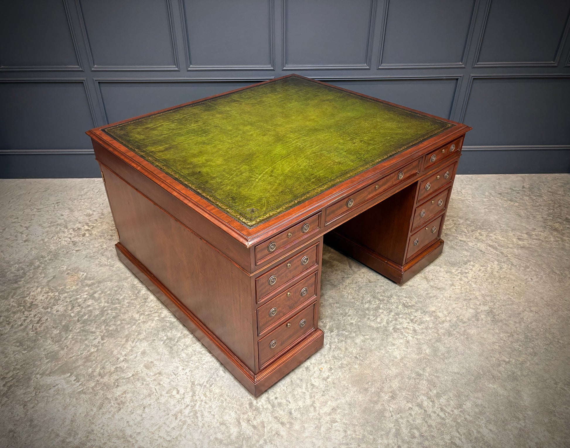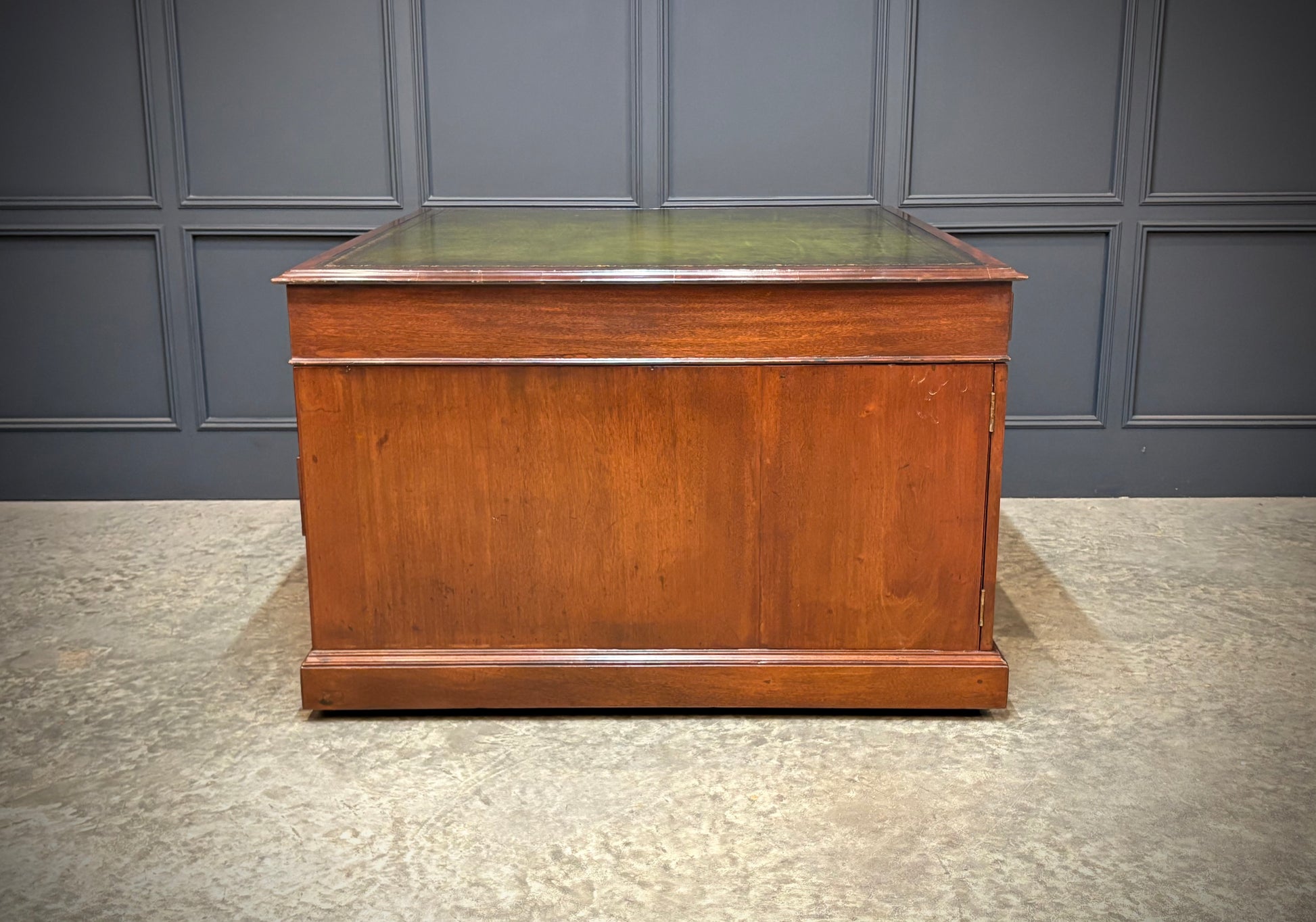 A superb quality 19th-century Victorian partners desk, made using rich mahogany and featuring a newly hand-dyed green leather writing surface. This generously proportioned piece is both elegant and practical, designed to accommodate two people working face-to-face, making it ideal for a library, study, or home office.