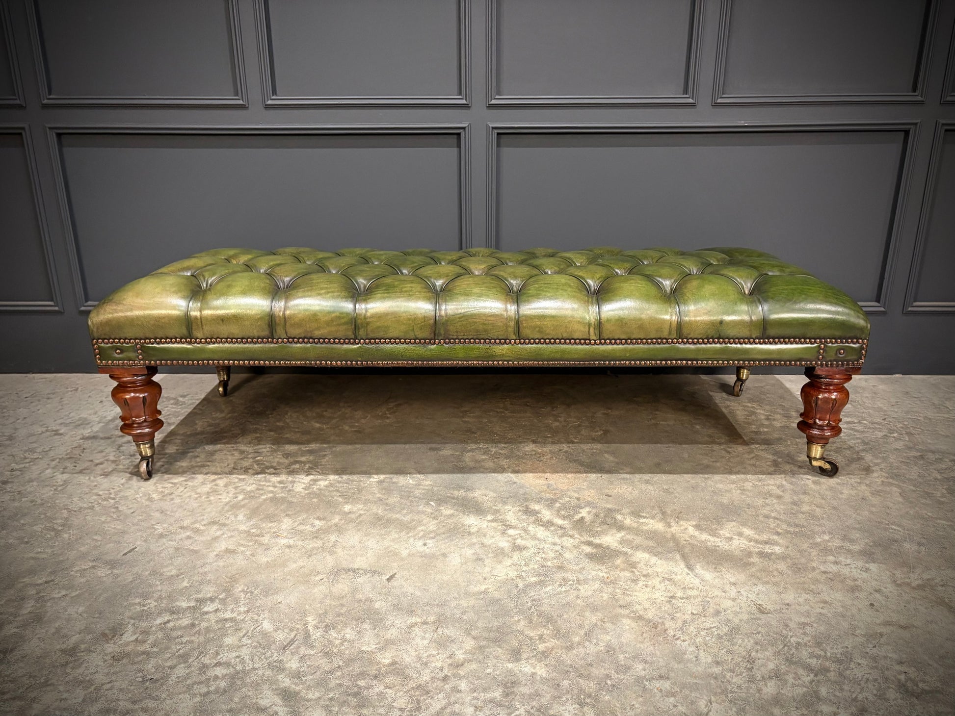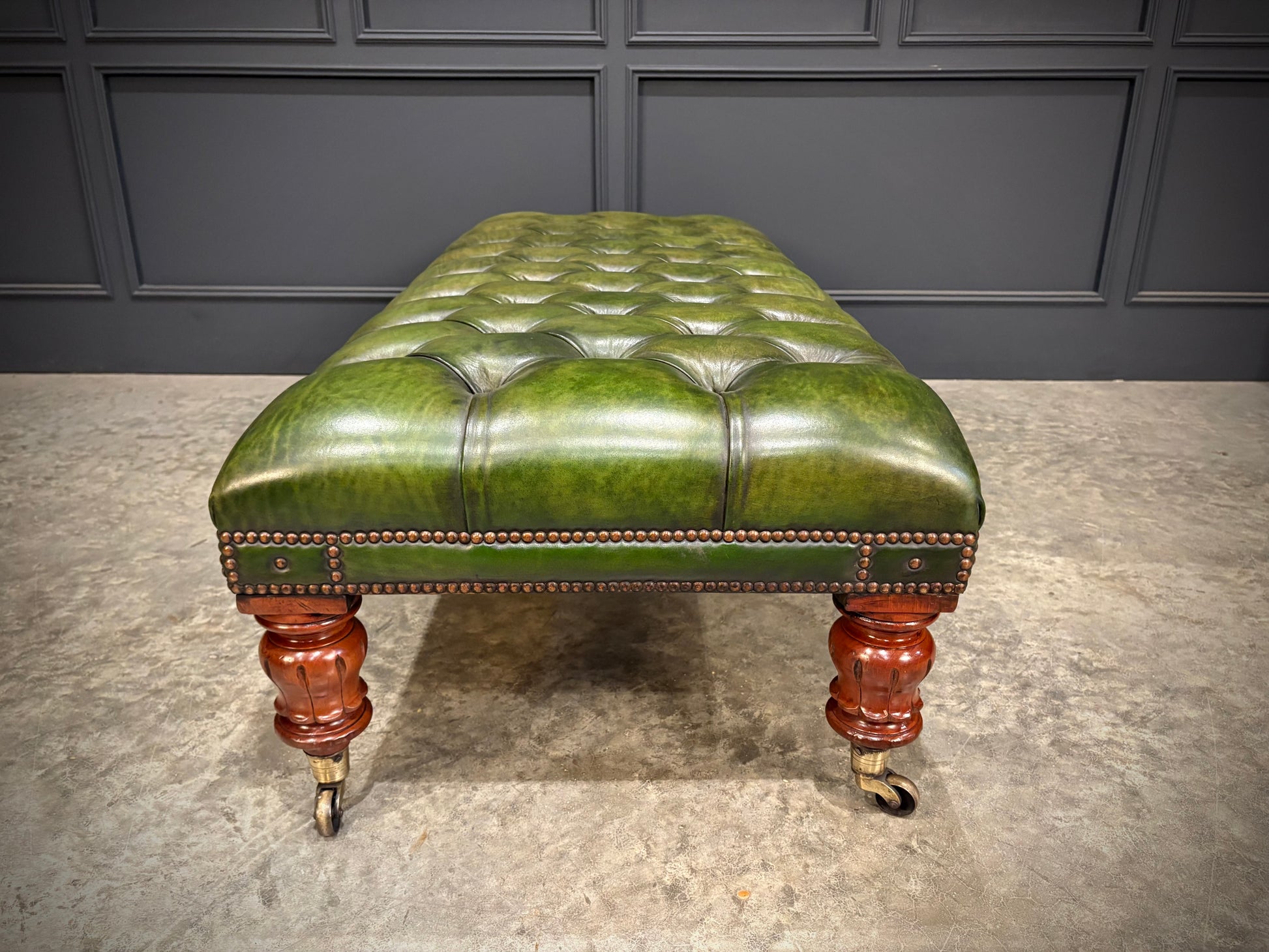 A fine large William IV mahogany footstool, traditionally upholstered in hand-dyed green leather.