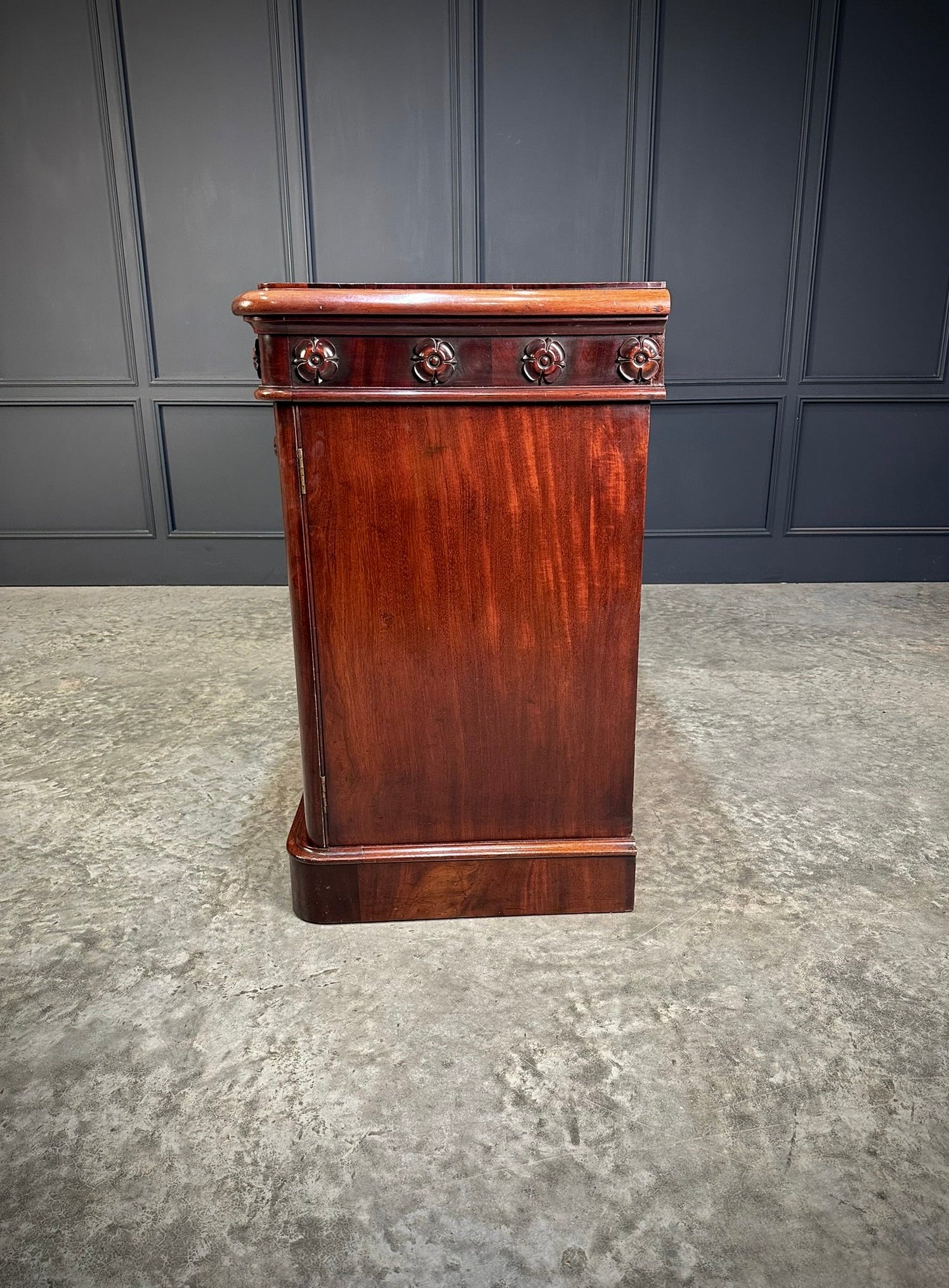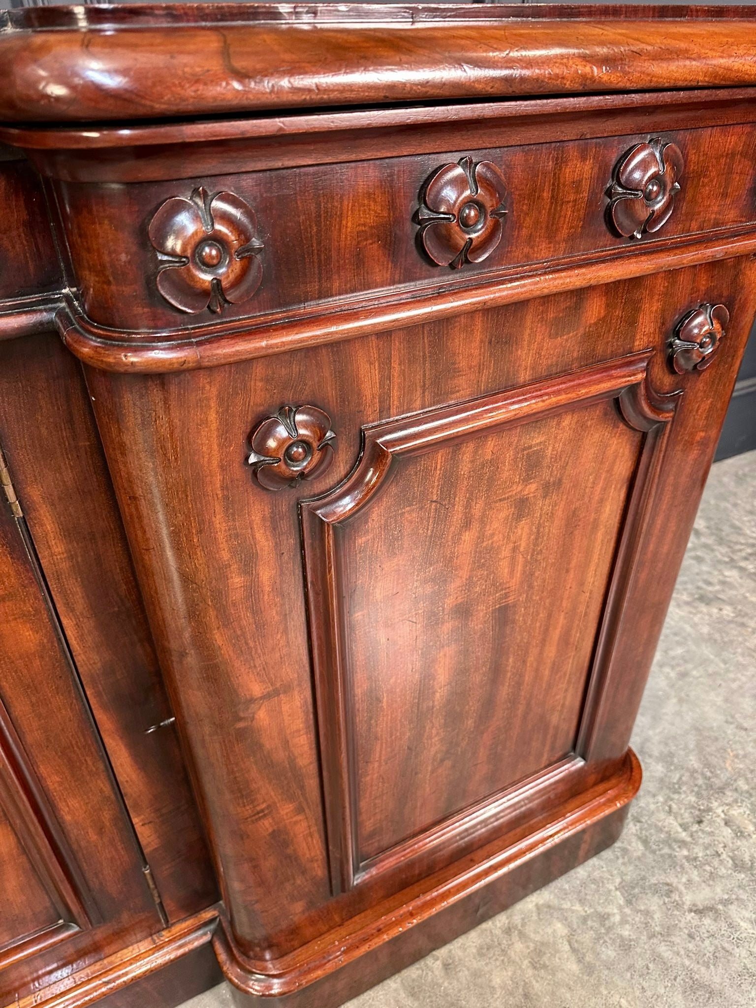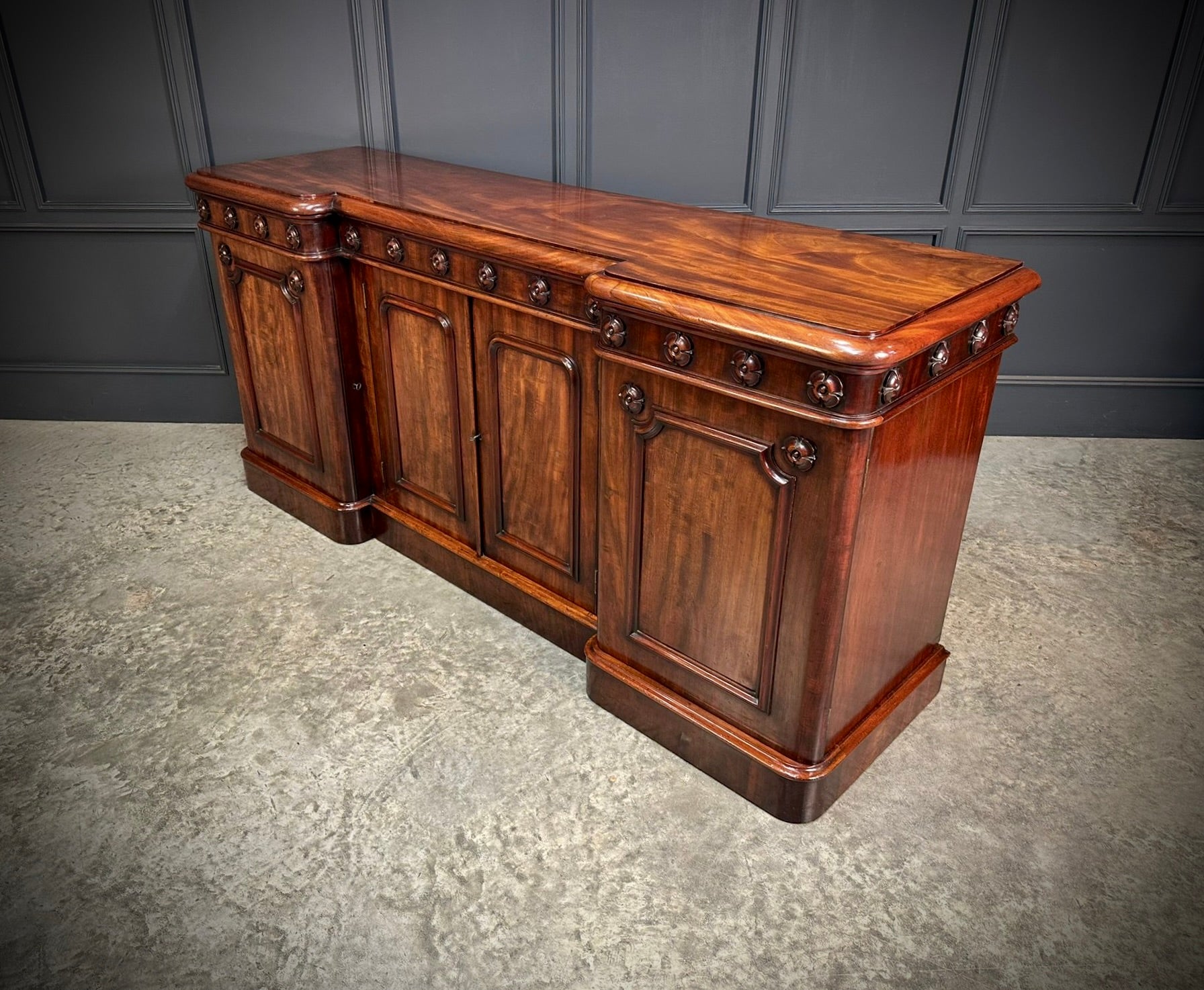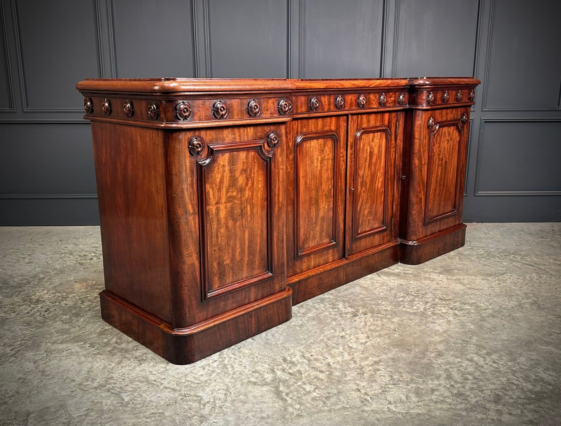 The inverted breakfront form is well proportioned and adorned with finely carved rosettes running along the frieze, complemented by moulded panel detailing to each door.