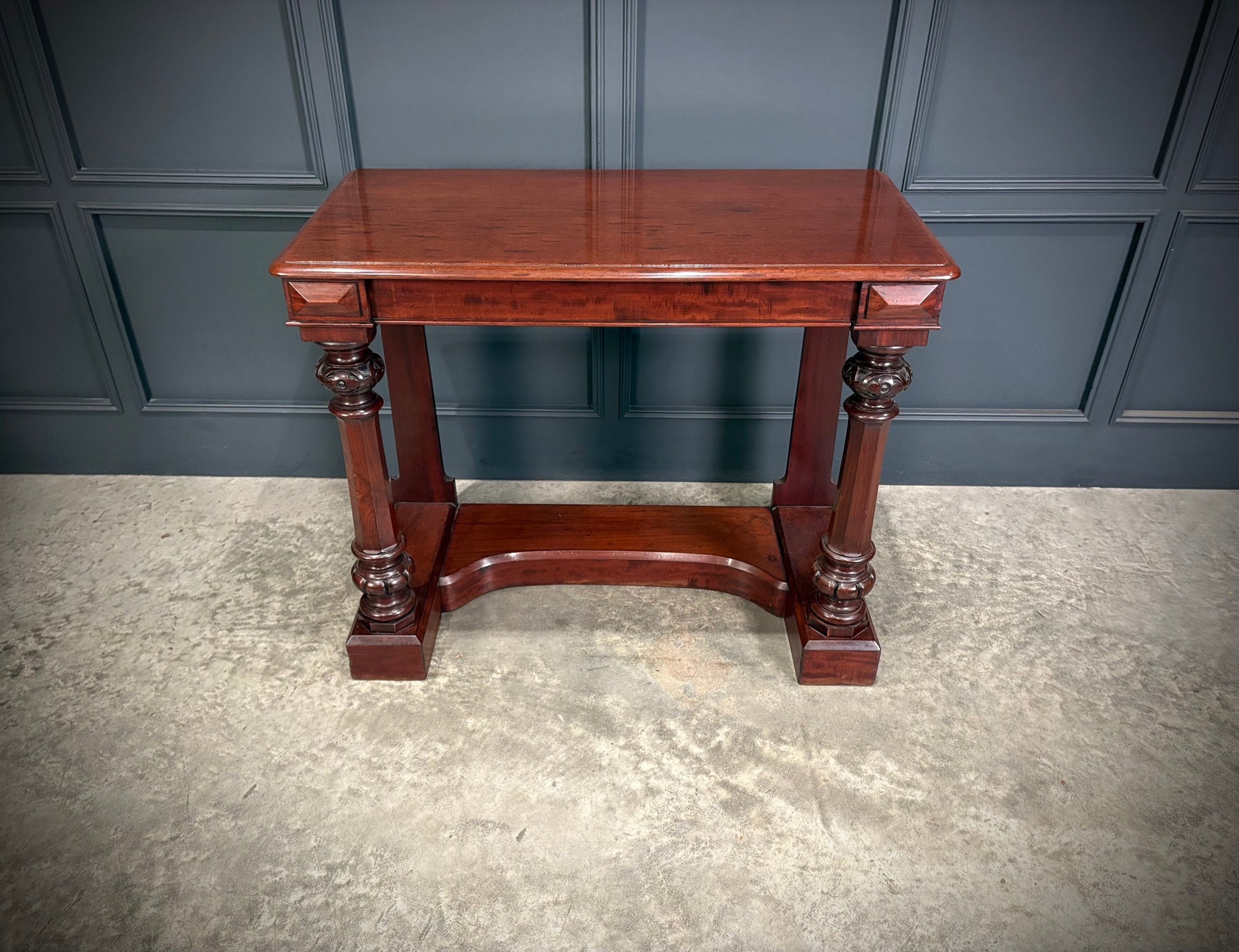 An elegant mahogany console table of classic Victorian design, raised on striking octagonal support columns with finely carved detailing and a concave shaped base.
