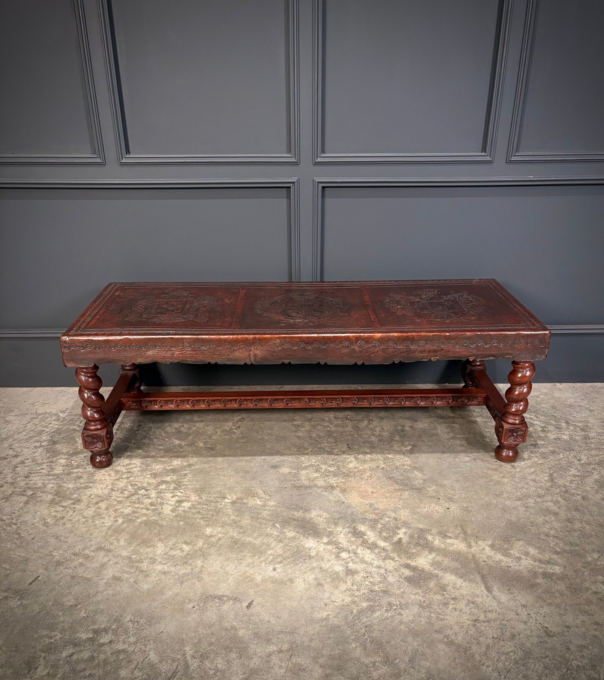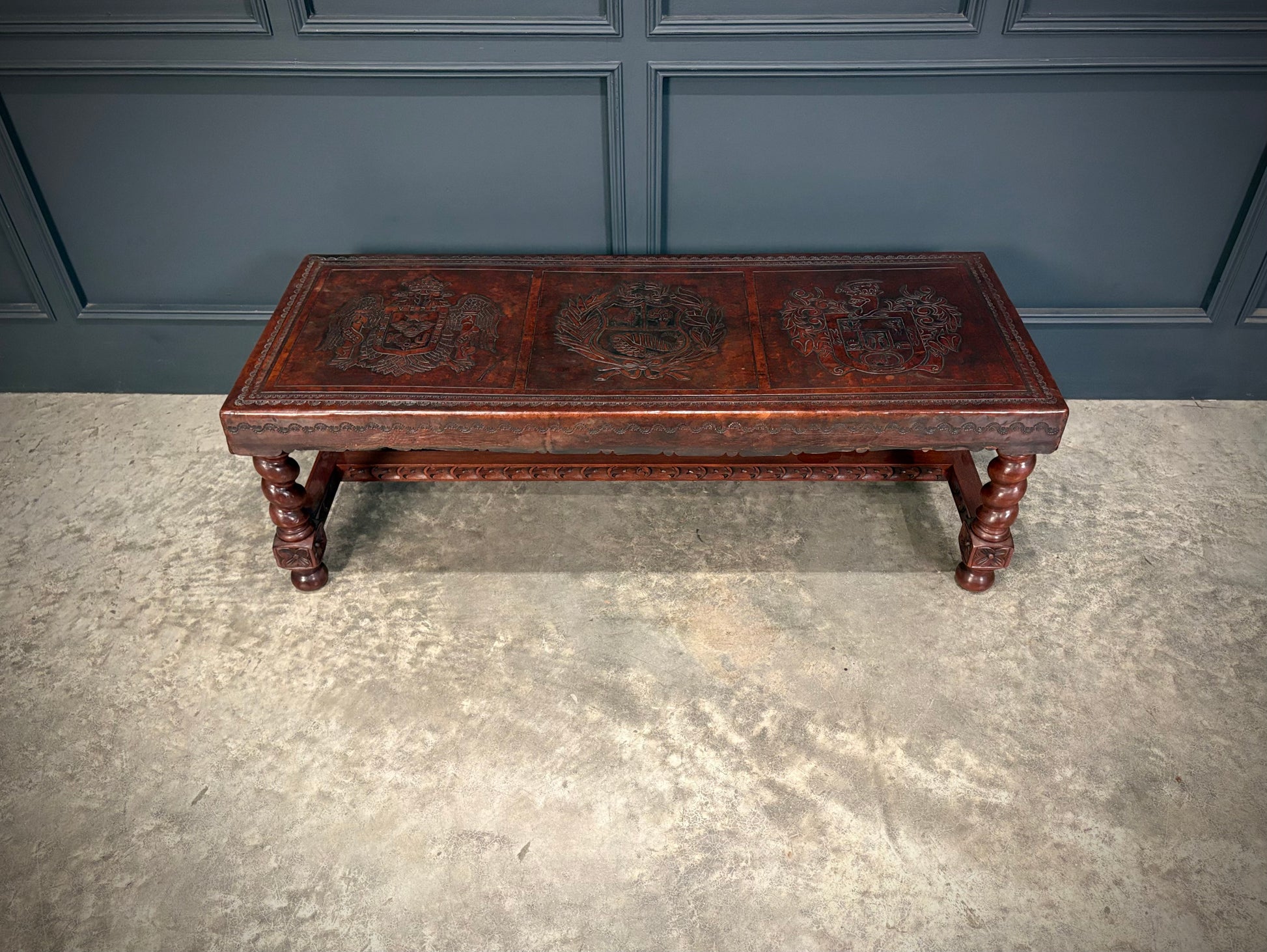 The leather surface is deeply embossed with three heraldic coat-of-arms panels, likely of Peruvian origin, and bordered with intricate tooling.