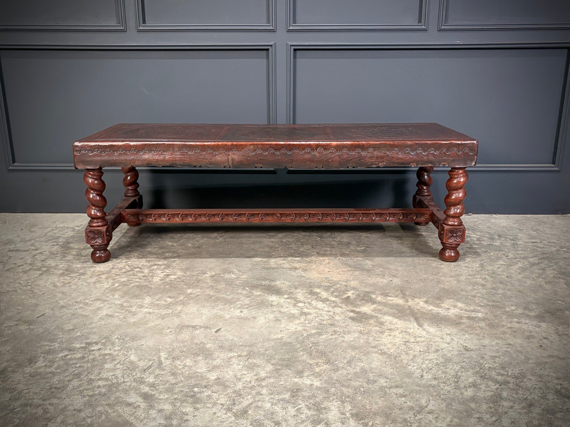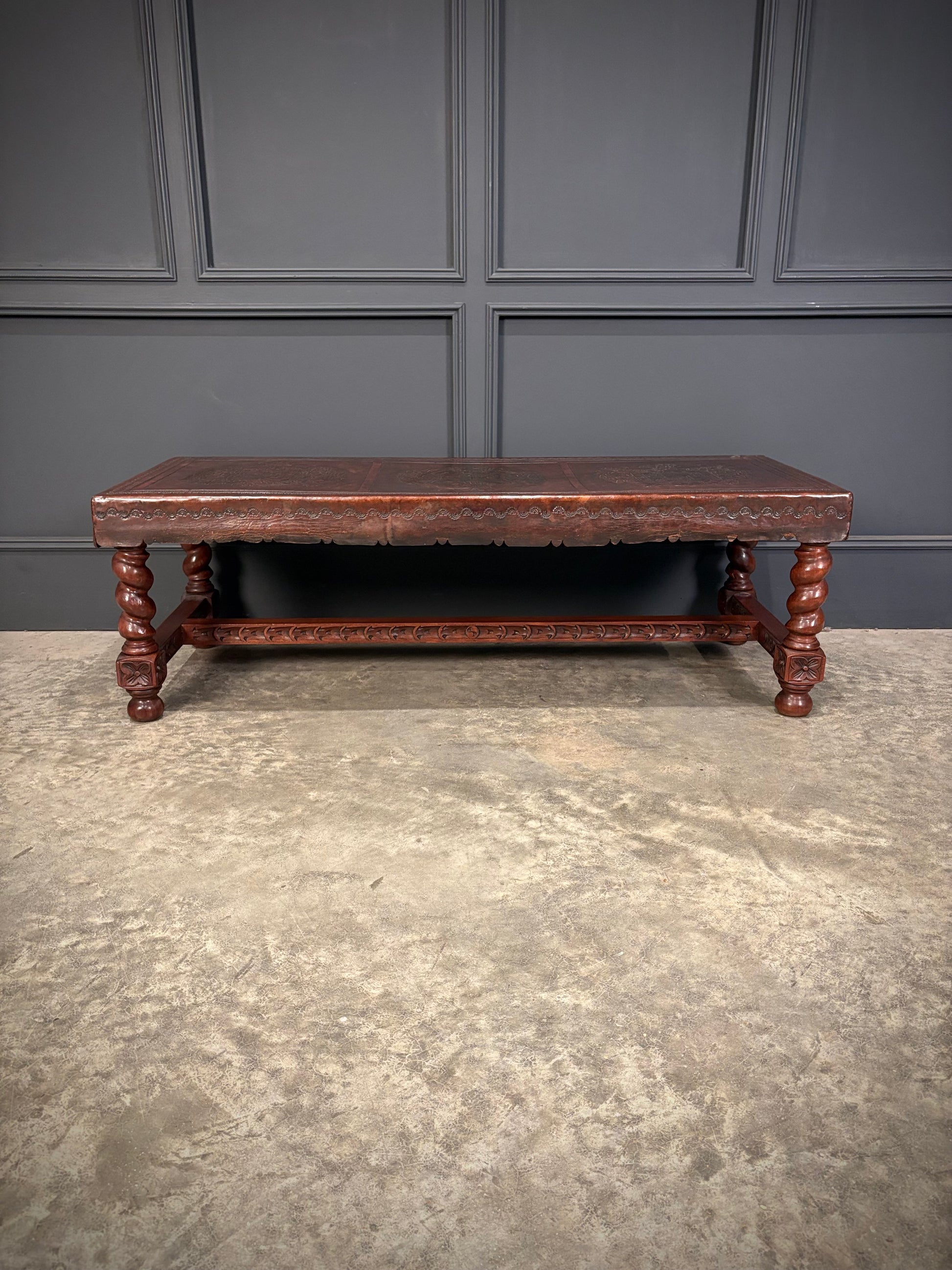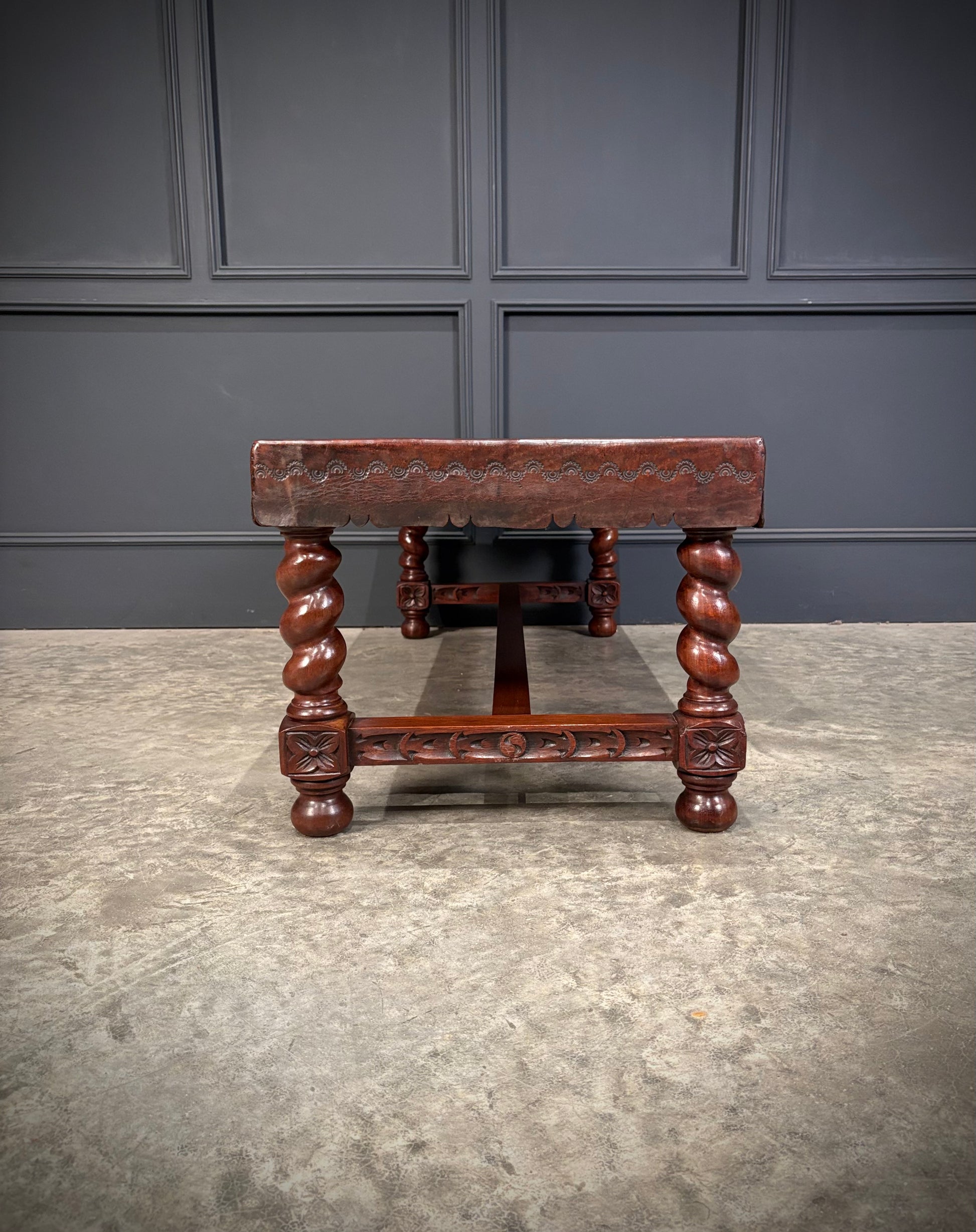 The base is made from solid mahogany with elegant barley twist legs, joined by a finely carved stretcher.