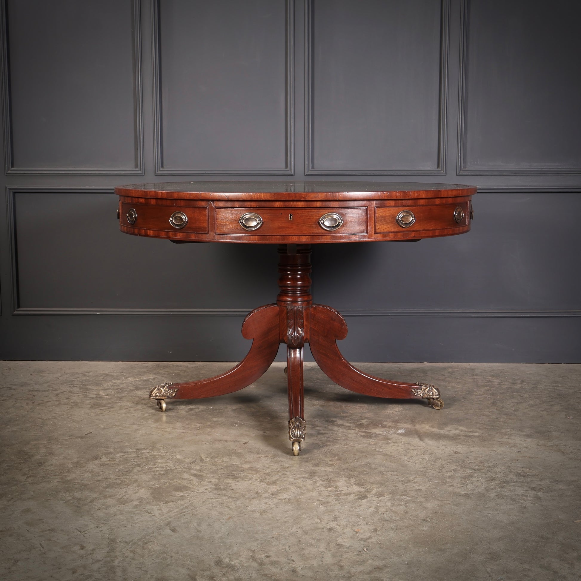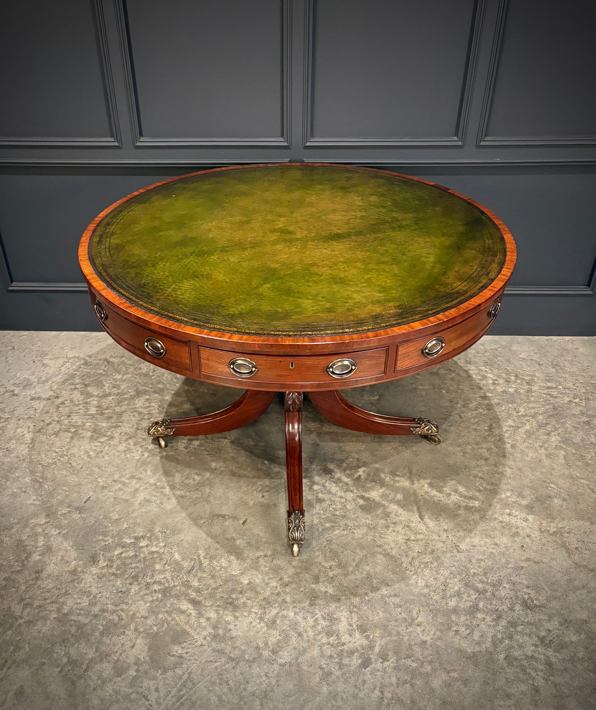 A fine late Regency mahogany drum table of excellent colour and proportions, featuring a newly hand-dyed green leather top with decorative tooling.