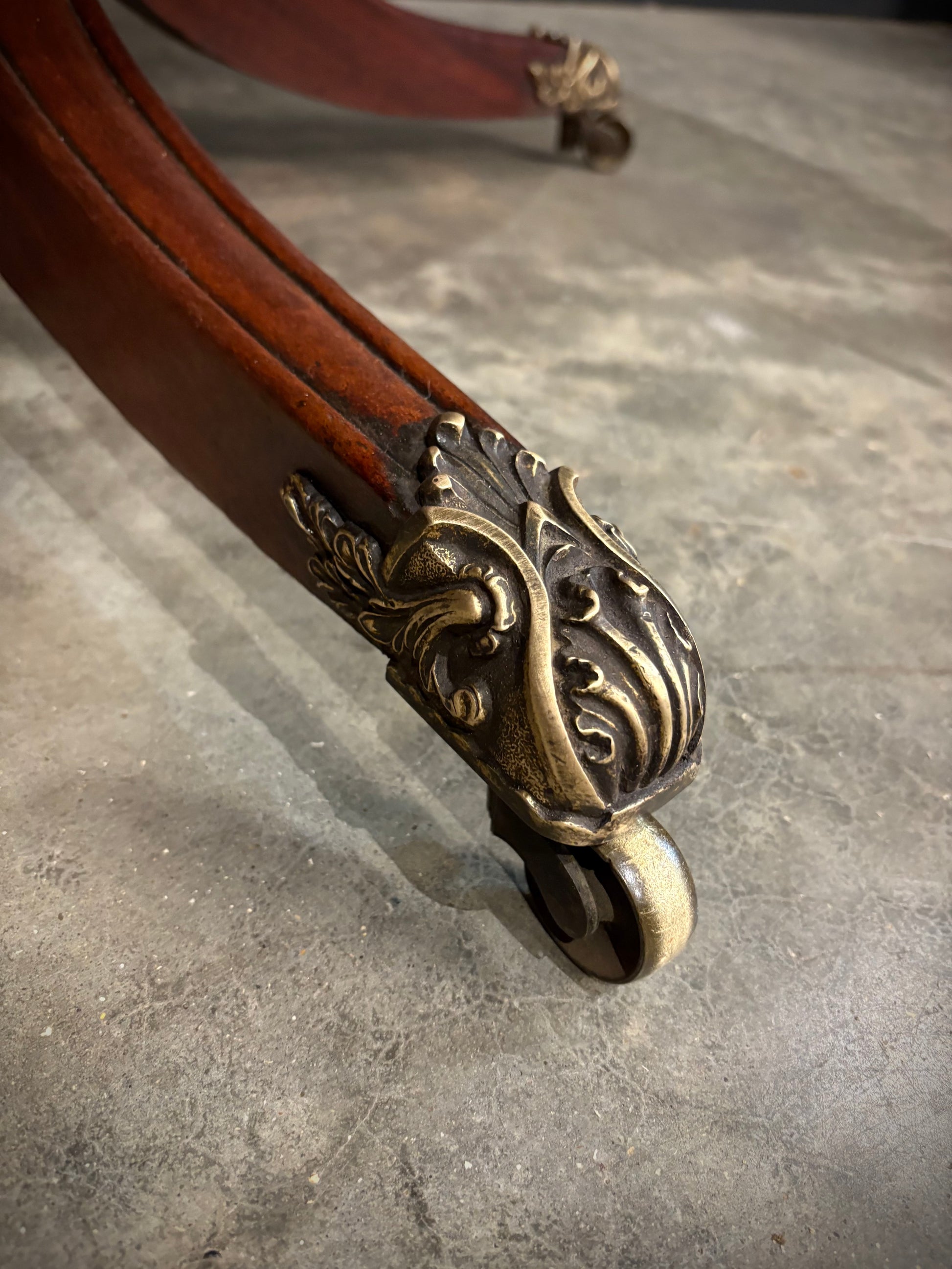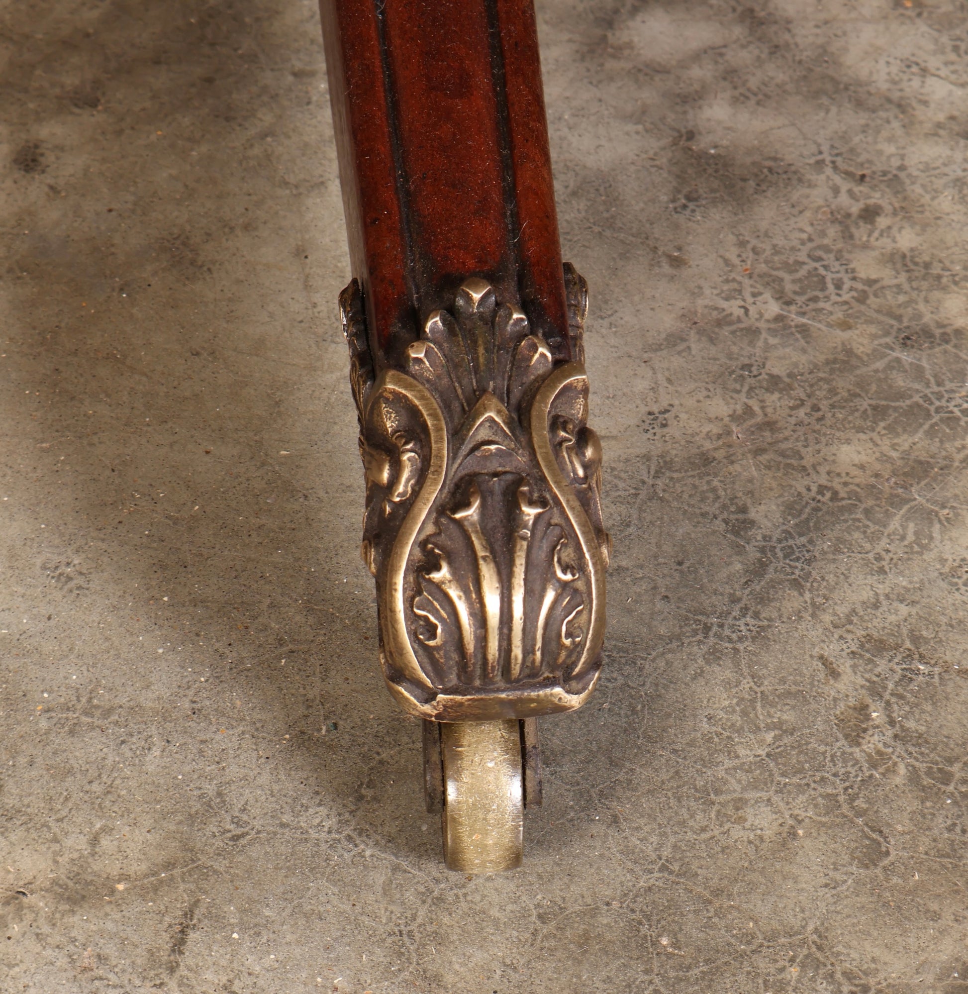 The table is raised on a turned central column leading to four elegant swept legs, each terminating in wonderful brass paw caps and castors.