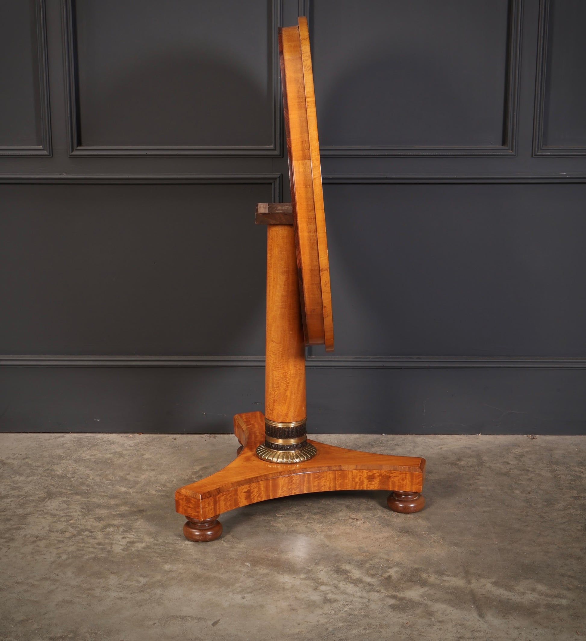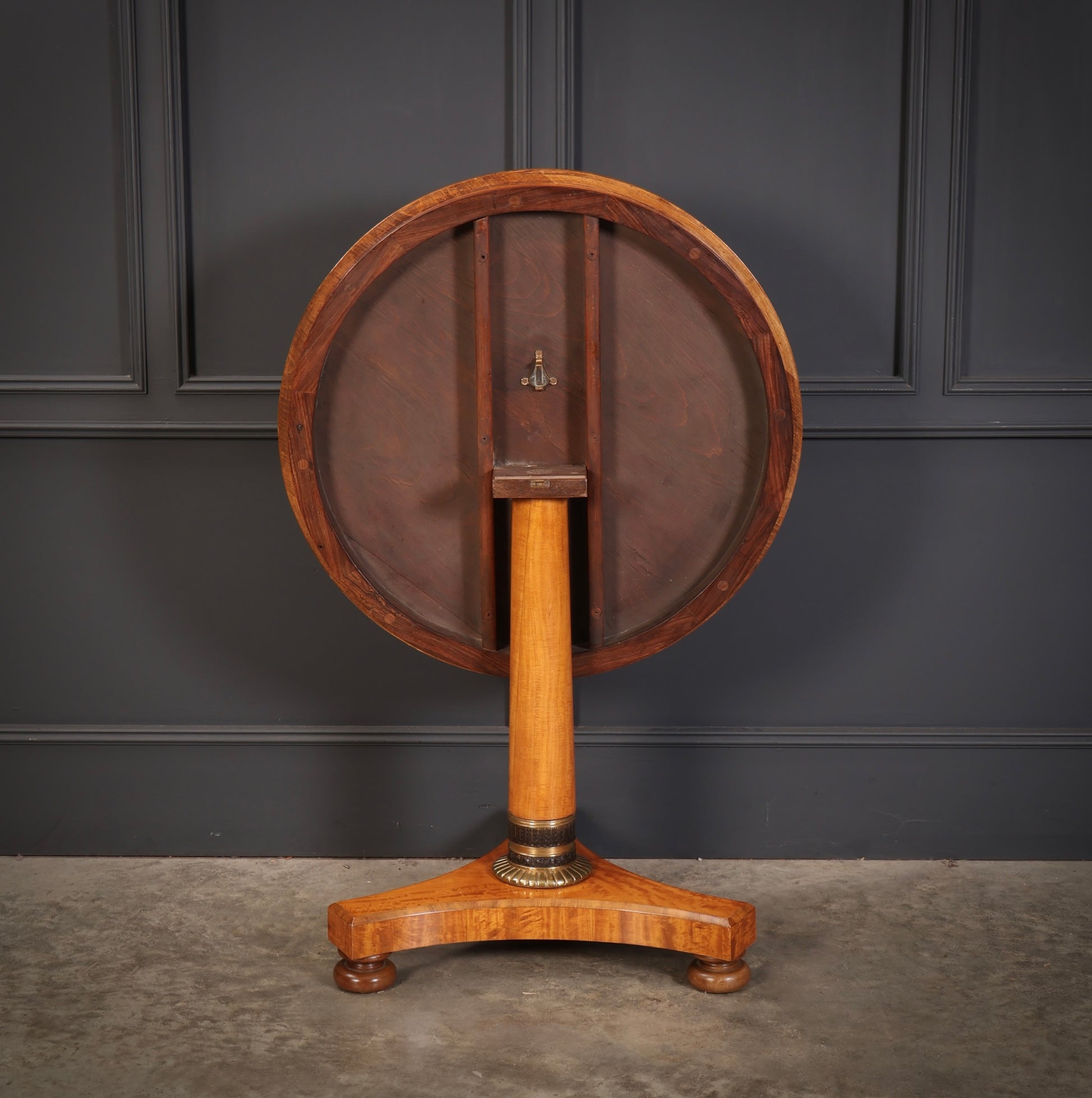 The top is mounted on a single turned satinwood column, rising from a bold, triangular platform base. The base is mounted with a decorative brass collar, adding a refined neoclassical detail to the design. Each corner of the platform terminates in a bun foot, providing stability and a graceful silhouette. The top is hinged to tilt vertically, making this table easy to move and store when not in use—a practical feature often found in high-quality occasional furniture of the period.