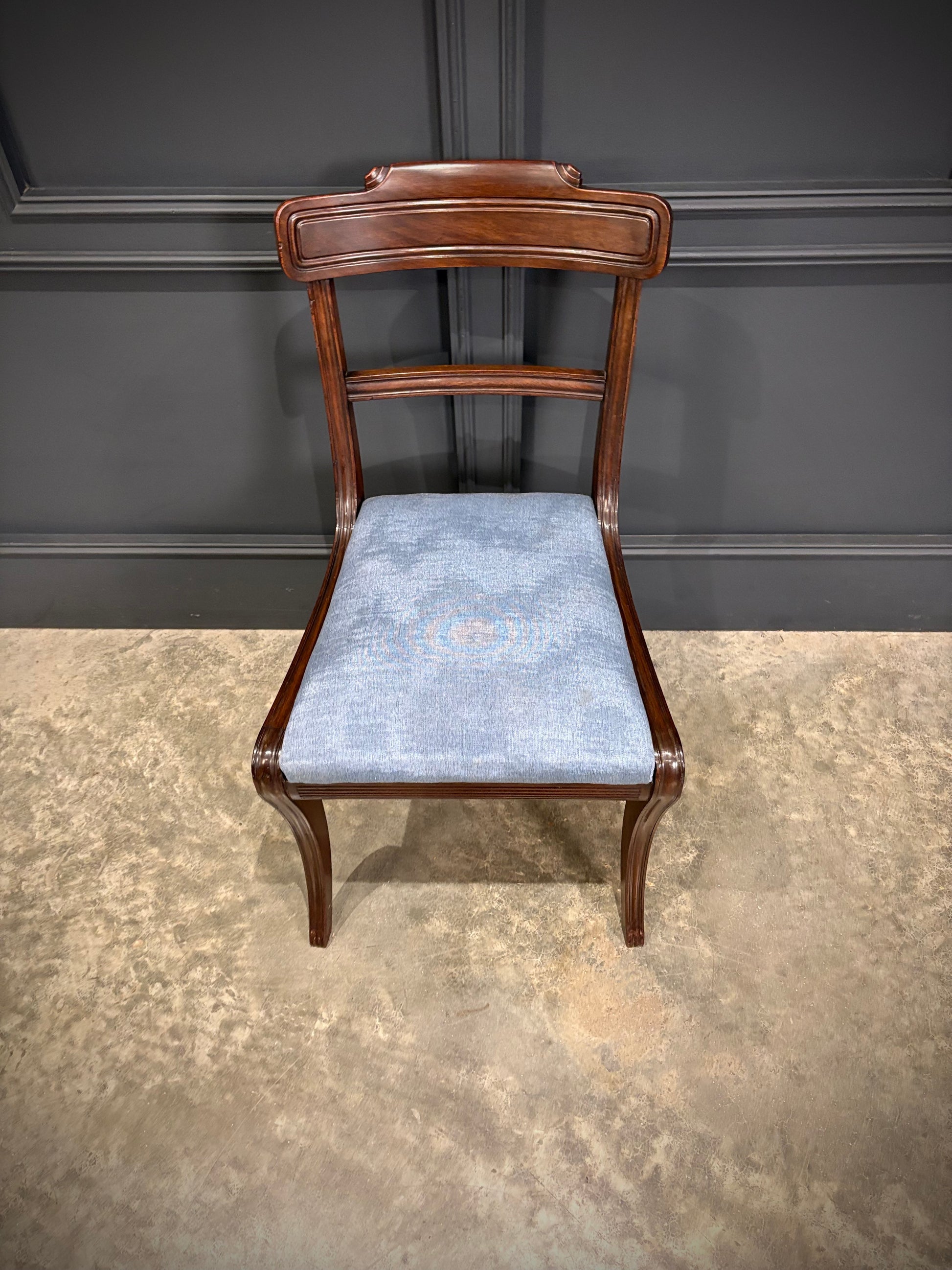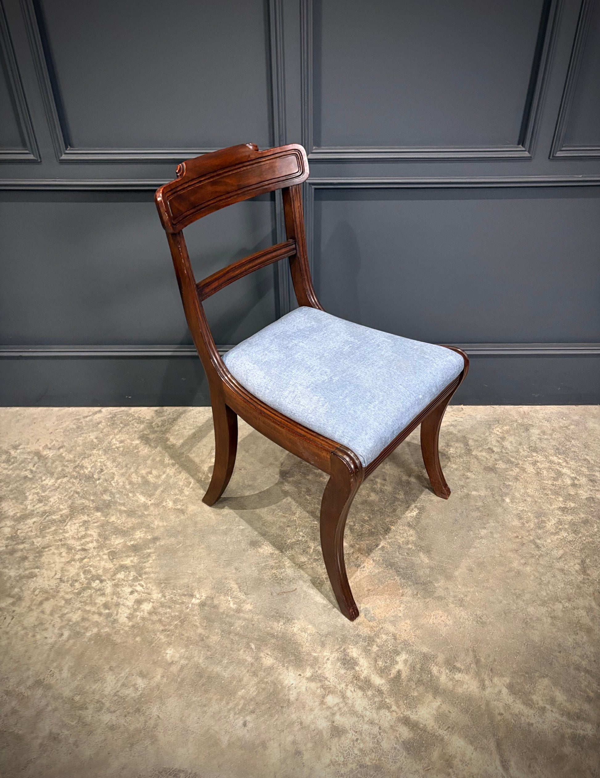 The chairs feature shaped bar backs and finely curved arms to the carvers, all raised on graceful sabre legs that give the set a light, refined appearance.