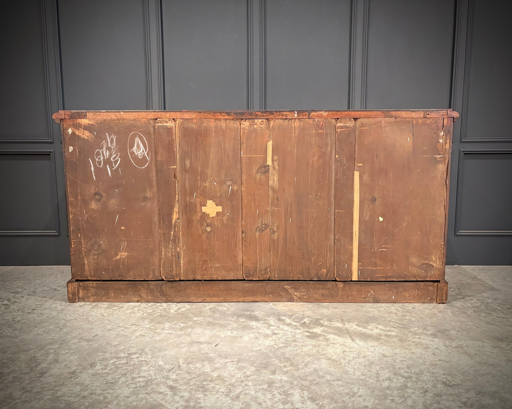 The central section includes a single drawer above a double-door cupboard, flanked by two larger side cupboards offering ample storage. Each door has arched mouldings and opens to reveal an arrangement of drawers.