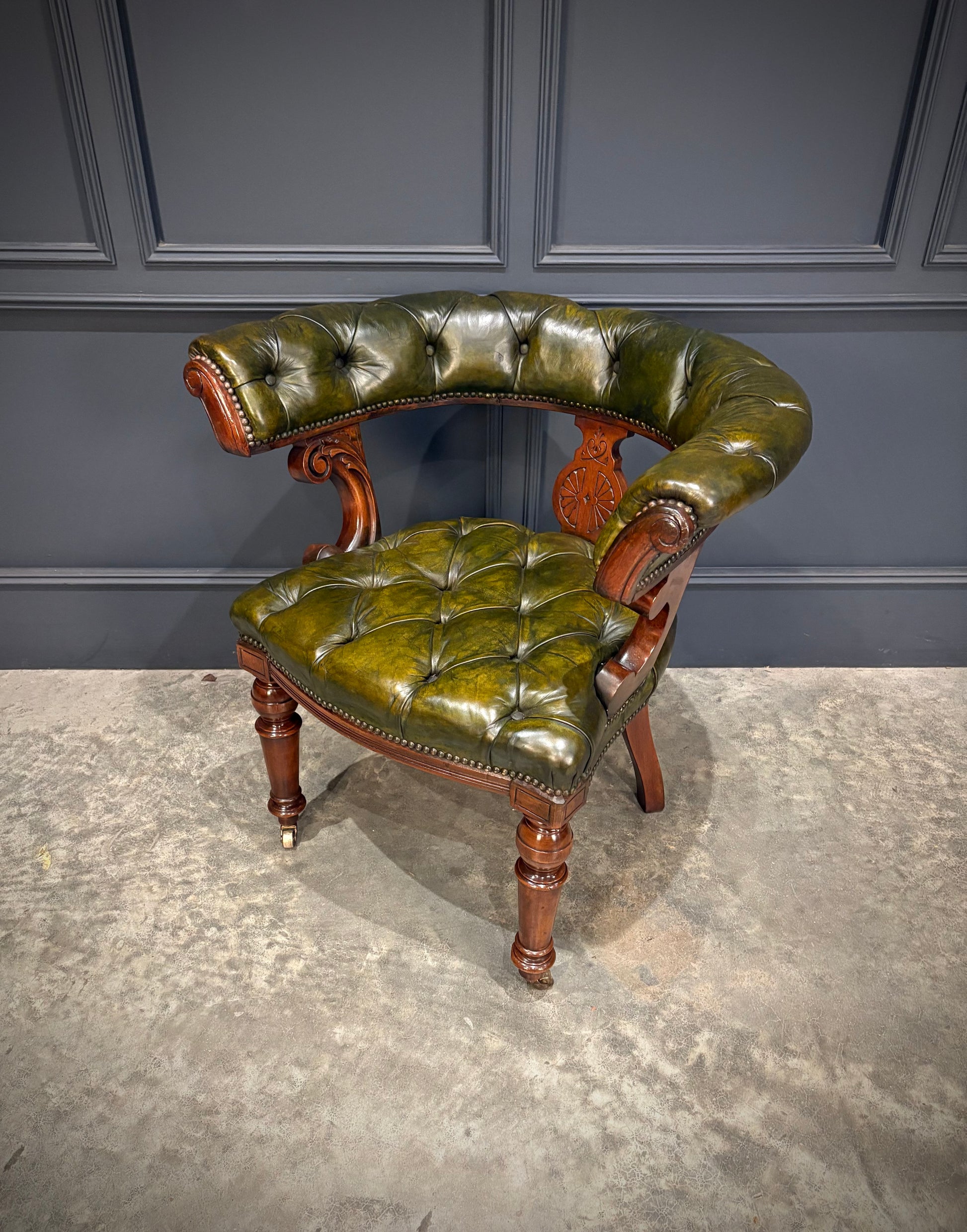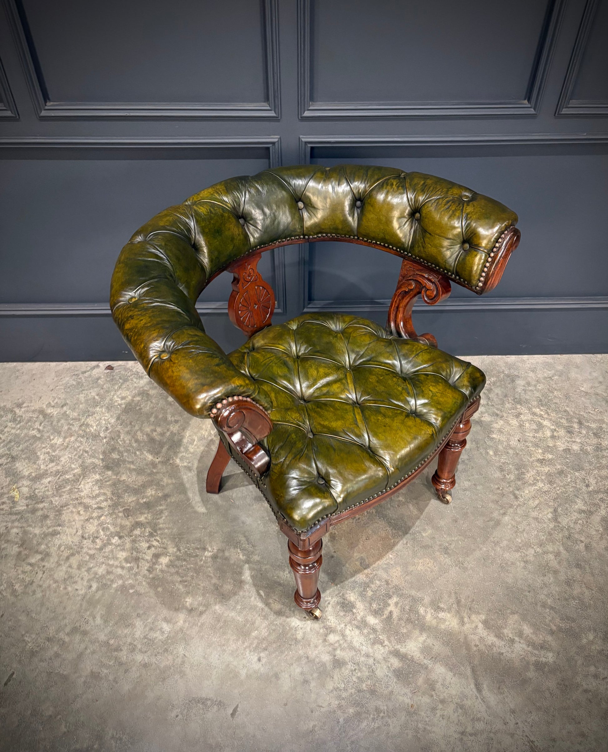 This attractive late Victorian mahogany desk chair has a beautifully shaped mahogany frame, featuring a sweeping horseshoe back supported by carved scroll brackets and standing on turned front legs with brass castors for smooth movement.