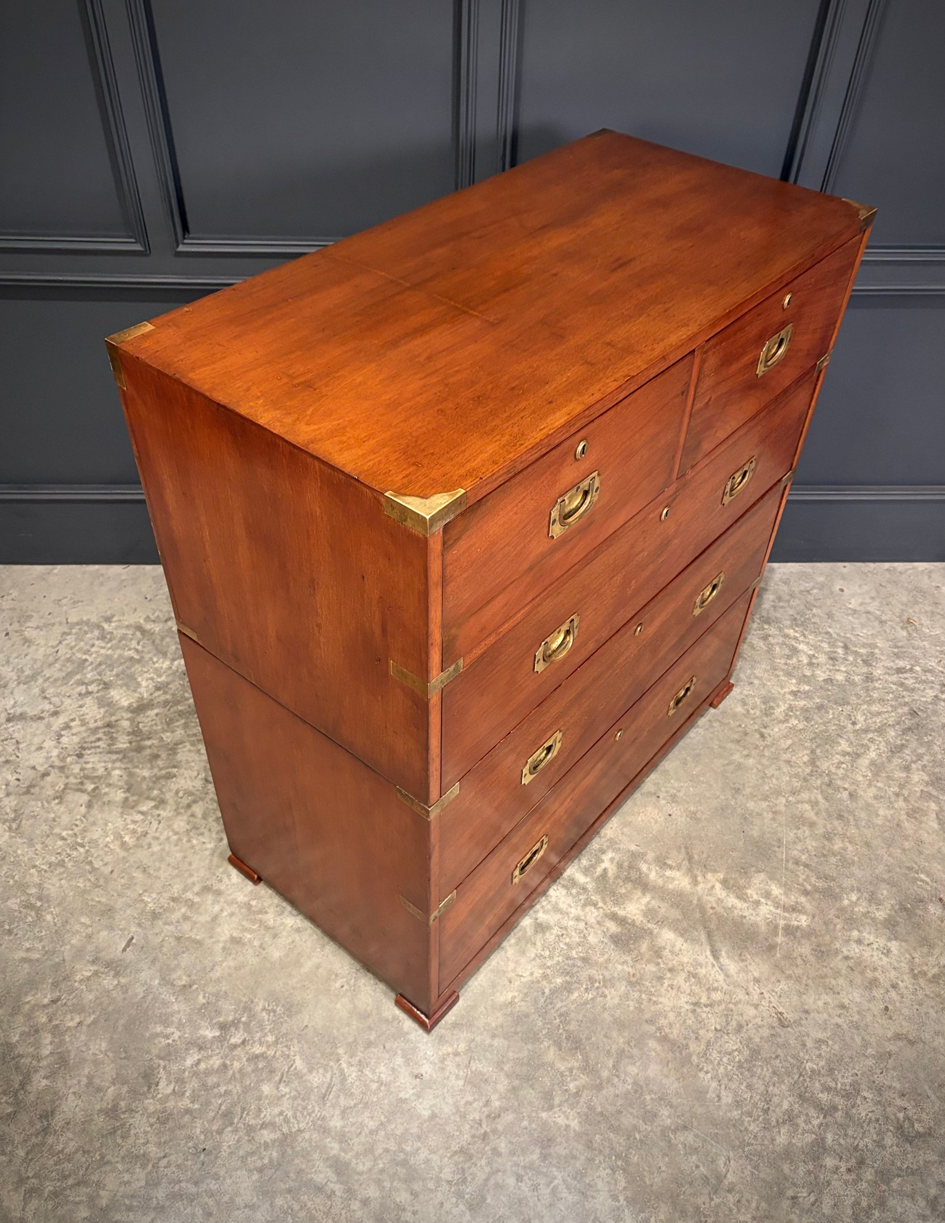 The chest comes in 2 pieces featuring classic brass bound corners and recessed campaign handles, along with a rich coloured mahogany.