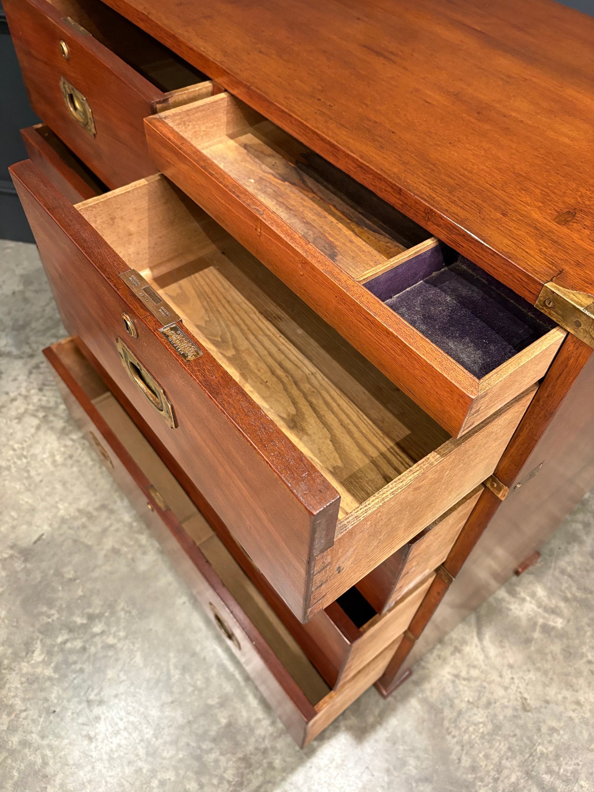 The piece retains an original maker’s label for Ross & Co., Dublin, one of the most renowned makers of campaign furniture in the Victorian period, known for supplying high-quality portable pieces to British army officers. Their work is particularly sought after for its durability, and clever design features.