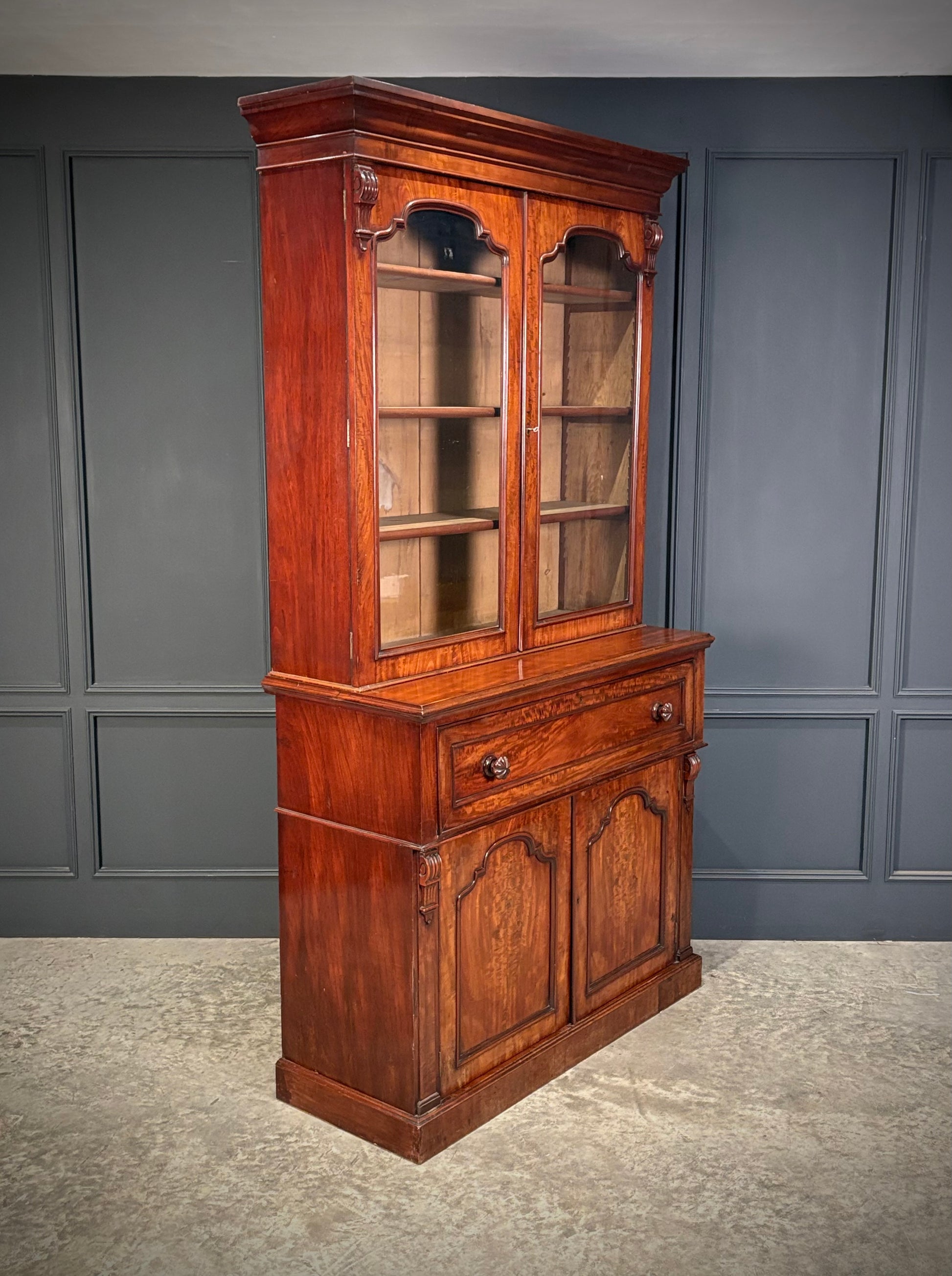 The upper section features a pair of glazed doors with working key, opening to reveal three height-adjustable shelves, ideal for displaying books or decorative pieces.