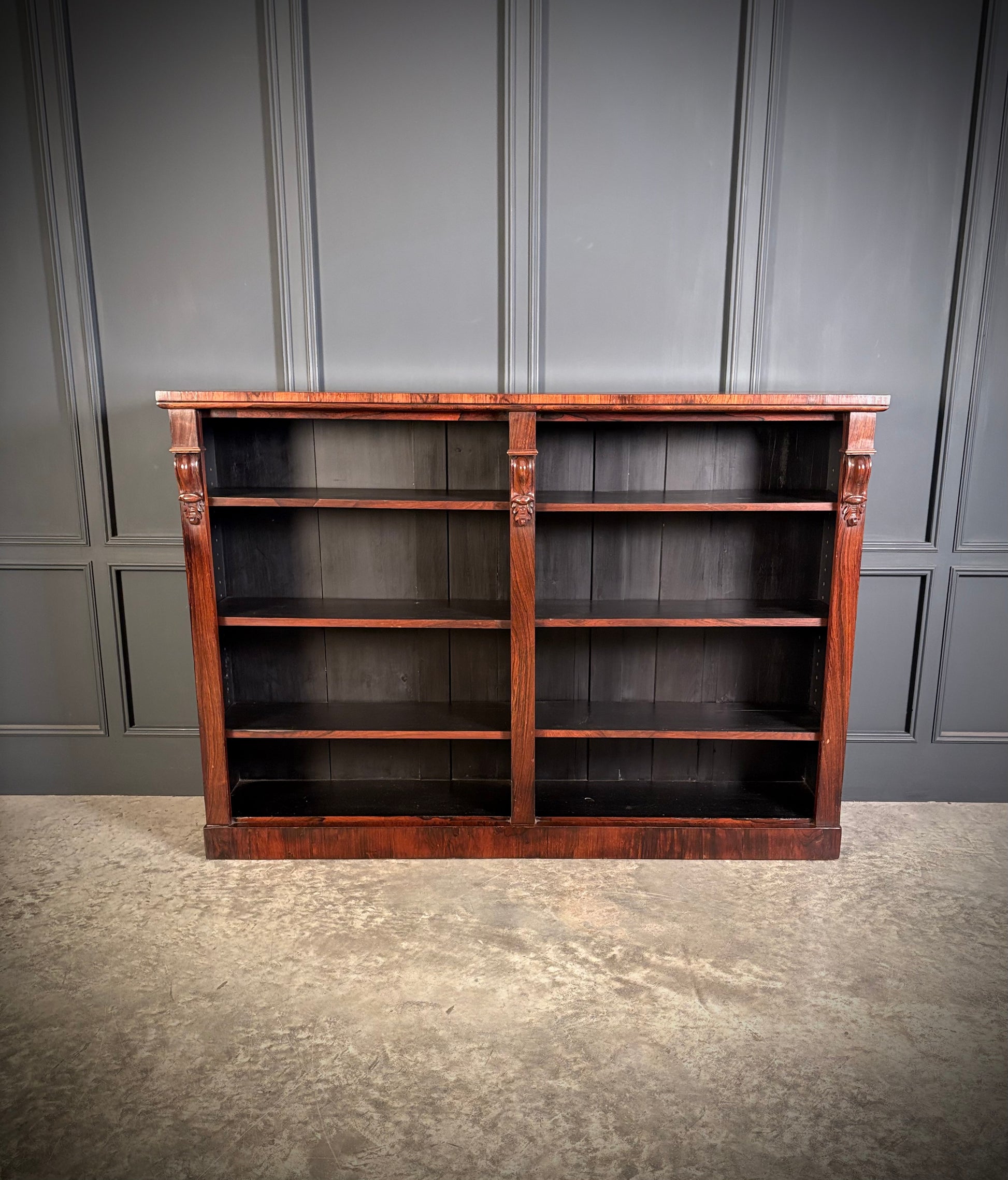 A beautifully proportioned Victorian open bookcase boasting richly figured rosewood, dating to around 1860.