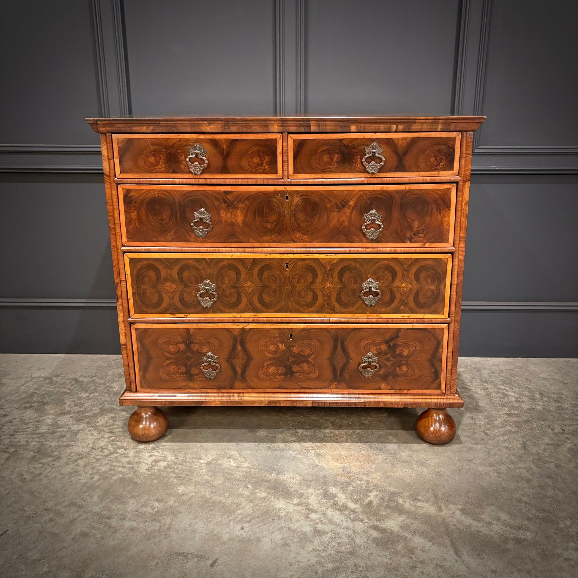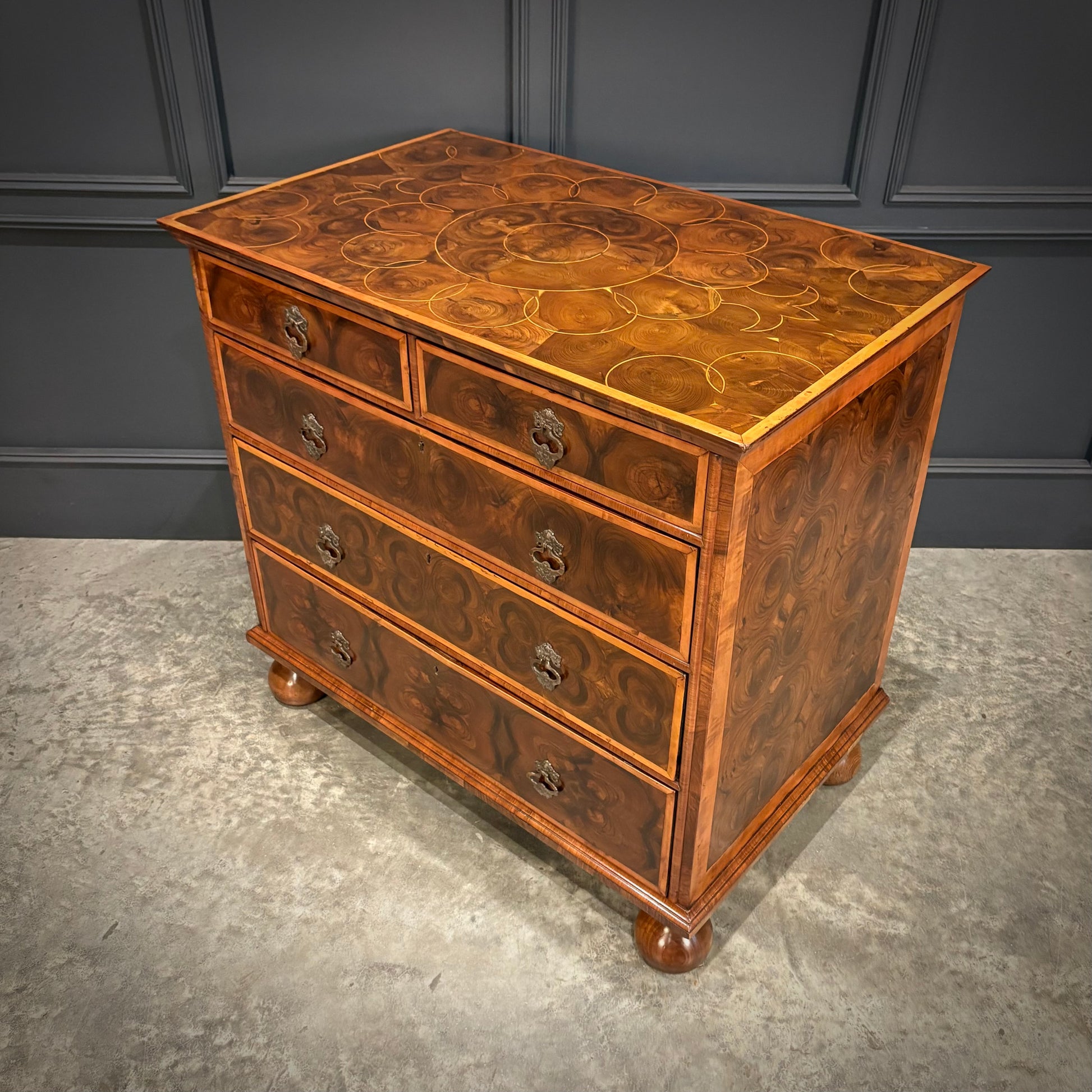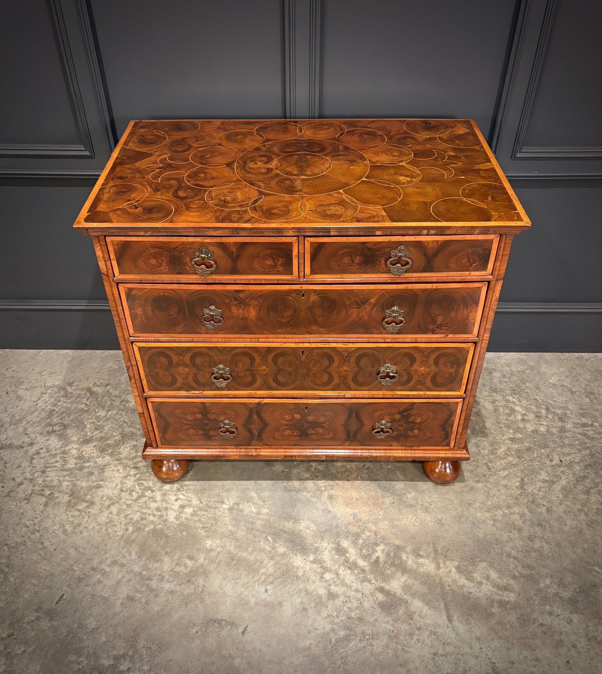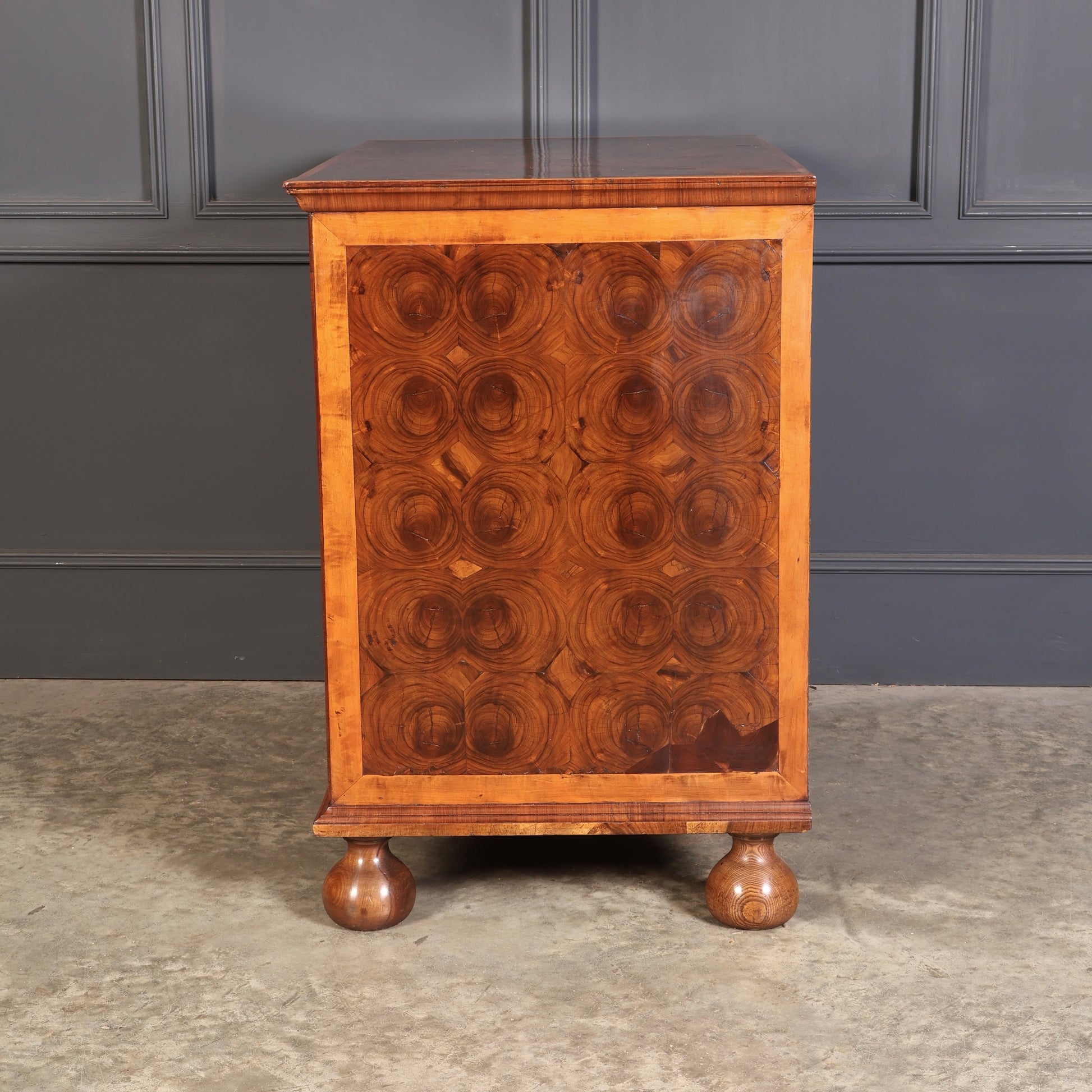 The top and drawer fronts are beautifully veneered in oyster-cut walnut, showing excellent colour and figuring.