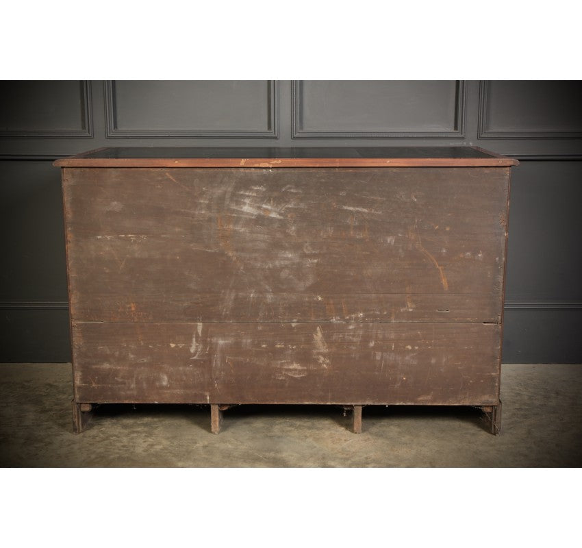 Inverted breakfront shape with a new black leather inset top and tooled edge.